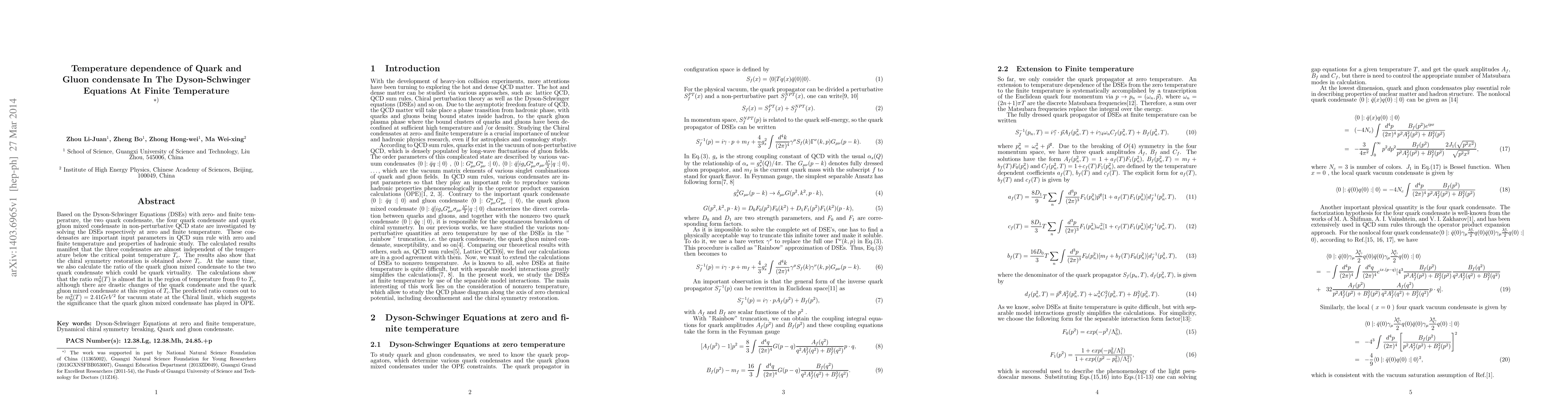 This study investigates the temperature dependence of quark and gluon condensates in non-perturbative QCD using Dyson-Schwinger Equations at zero and finite temperatures. Below the critical temperature $T_{c}$, these condensates remain nearly temperature-independent, but chiral symmetry restoration occurs above $T_{c}$. The calculated ratio of quark gluon mixed condensate to quark condensate indicates a nearly flat value in the vacuum state, suggesting the importance of the quark gluon mixed condensate in Operator Product Expansion (OPE).