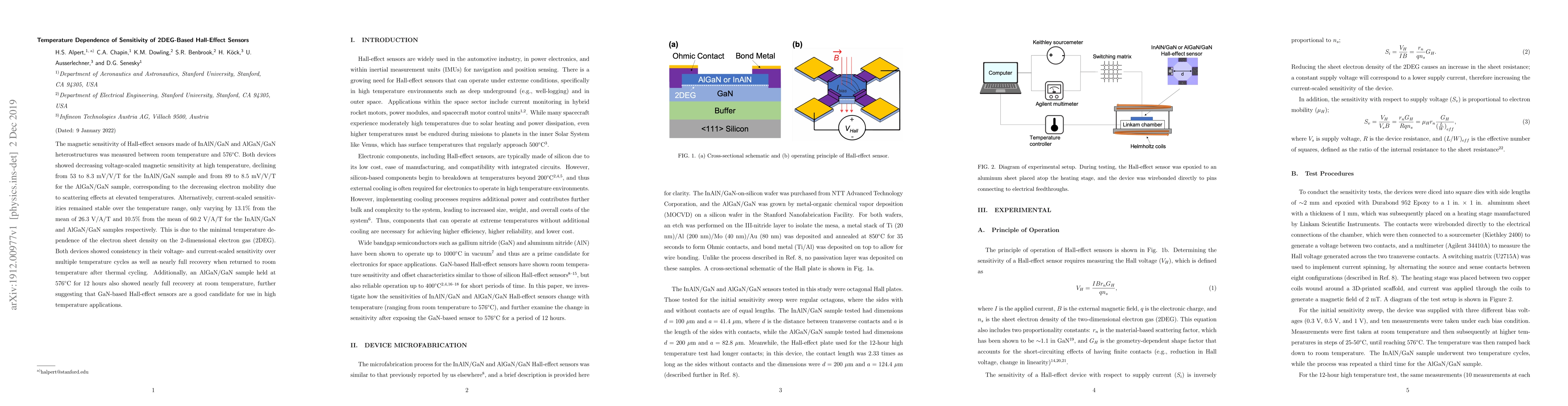 The magnetic sensitivity of Hall-effect sensors made of InAlN/GaN and AlGaN/GaN heterostructures was measured between room temperature and 576{\deg}C. Both devices showed decreasing voltage-scaled magnetic sensitivity at high temperature, declining from 53 to 8.3 mV/V/T for the InAlN/GaN sample and from 89 to 8.5 mV/V/T for the AlGaN/GaN sample, corresponding to the decreasing electron mobility due to scattering effects at elevated temperatures. Alternatively, current-scaled sensitivities remained stable over the temperature range, only varying by 13.1% from the mean of 26.3 V/A/T and 10.5% from the mean of 60.2 V/A/T for the InAlN/GaN and AlGaN/GaN samples respectively. This is due to the minimal temperature dependence of the electron sheet density on the 2-dimensional electron gas (2DEG). Both devices showed consistency in their voltage- and current-scaled sensitivity over multiple temperature cycles as well as nearly full recovery when returned to room temperature after thermal cycling. Additionally, an AlGaN/GaN sample held at 576{\deg}C for 12 hours also showed nearly full recovery at room temperature, further suggesting that GaN-based Hall-effect sensors are a good candidate for use in high temperature applications.