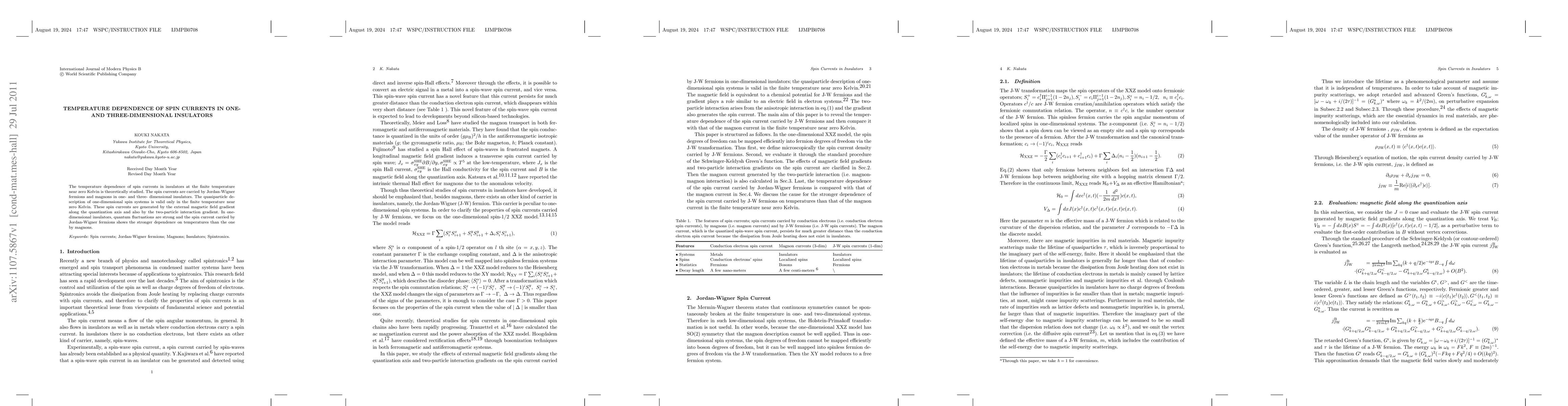 This paper investigates the temperature dependence of spin currents in one- and three-dimensional insulators, focusing on systems near zero Kelvin. It finds that spin currents in one-dimensional insulators, carried by Jordan-Wigner fermions and magnons, exhibit stronger temperature dependence than those in three-dimensional systems.