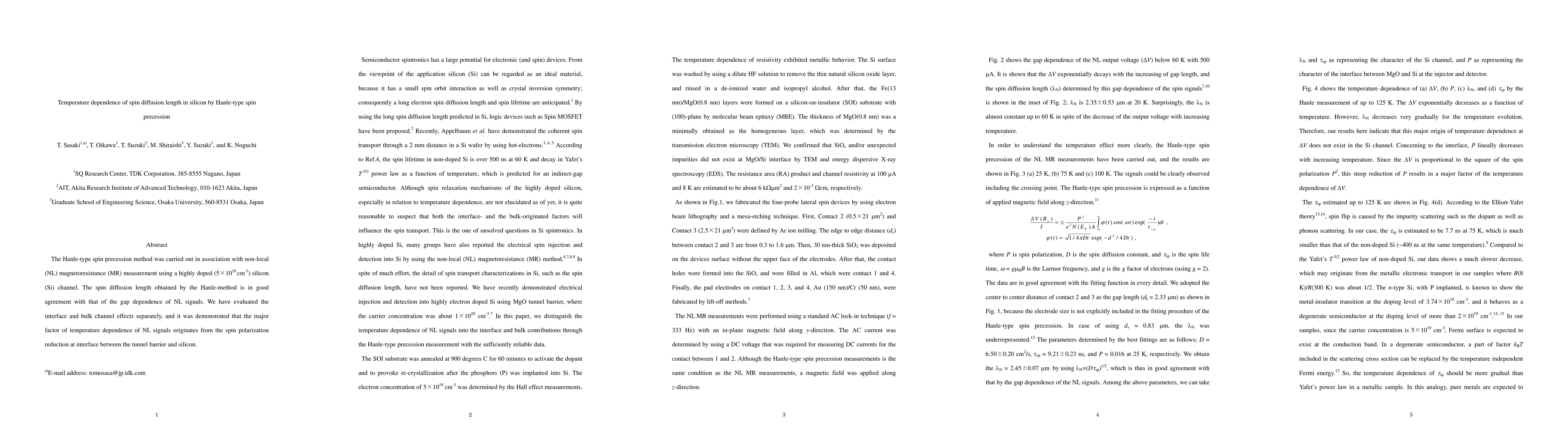 This study investigates the temperature dependence of spin diffusion length in silicon using Hanle-type spin precession and non-local magnetoresistance measurements. The results show that the primary temperature-dependent effect arises from spin polarization reduction at the interface between the tunnel barrier and silicon.
