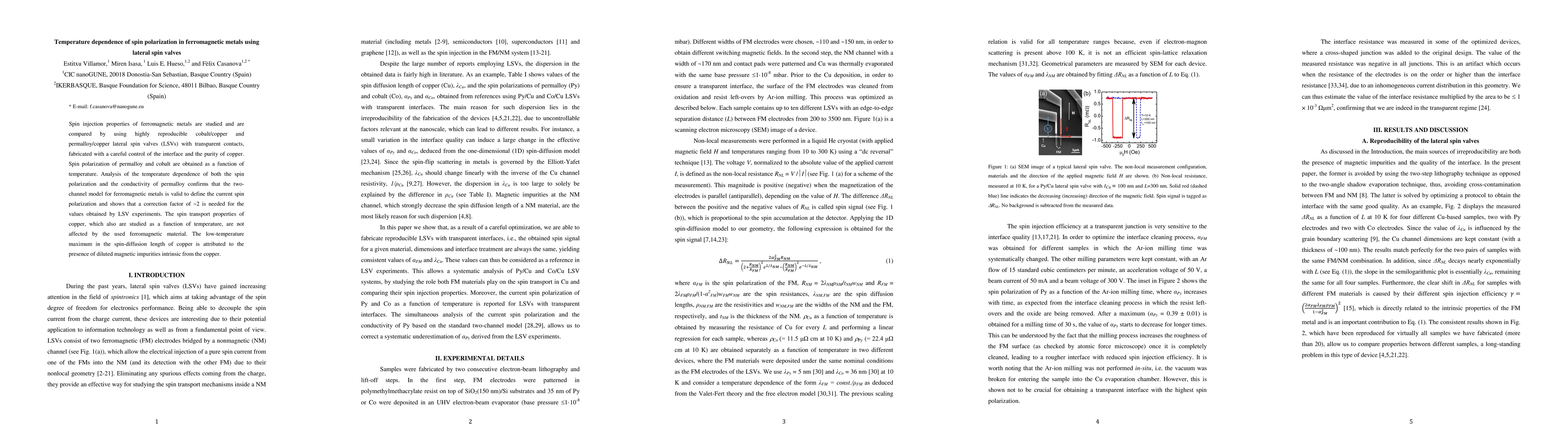 This study investigates the temperature dependence of spin polarization in cobalt/copper and permalloy/copper lateral spin valves, revealing long spin diffusion lengths due to optimized interface quality and copper purity. The analysis suggests a ~2 correction factor is needed for spin polarization values derived from experiments, based on the two-channel model for ferromagnetic metals.
