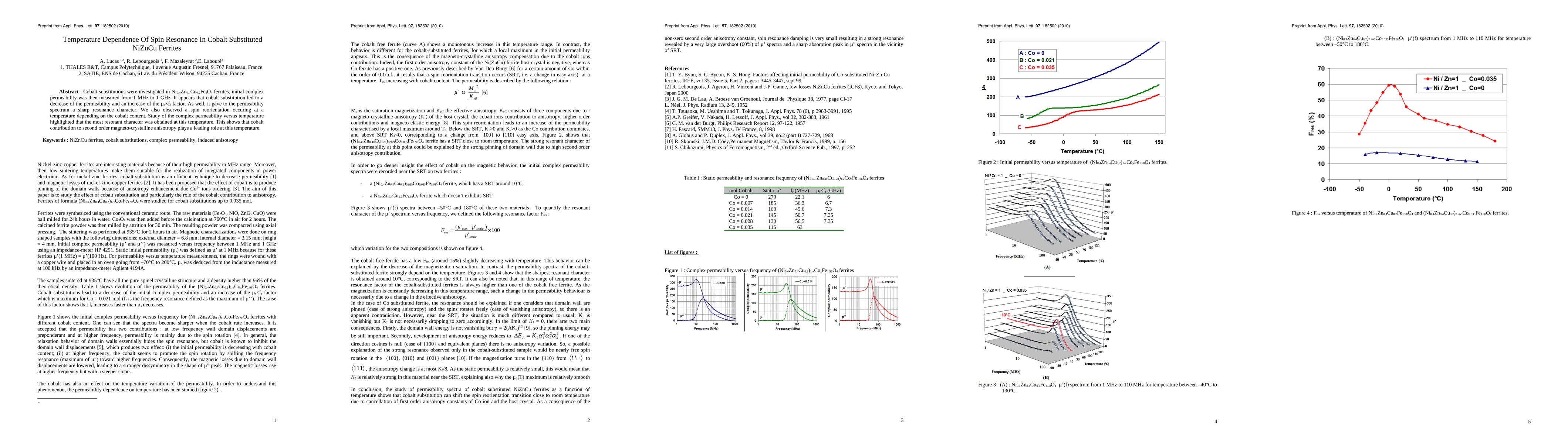 Cobalt substitutions were investigated in Ni0.4Zn0.4Cu0.2Fe2O4 ferrites, initial complex permeability was then measured from 1 MHz to 1 GHz. It appears that cobalt substitution led to a decrease in the permeability and an increase in the \mus\timesfr factor. As well, it gave to the permeability spectrum a sharp resonance character. We also observed a spin reorientation occurring at a temperature depending on the cobalt content. Study of the complex permeability versus temperature highlighted that the most resonant character was obtained at this temperature. This shows that cobalt contribution to second order magnetocrystalline anisotropy plays a leading role at this temperature.
