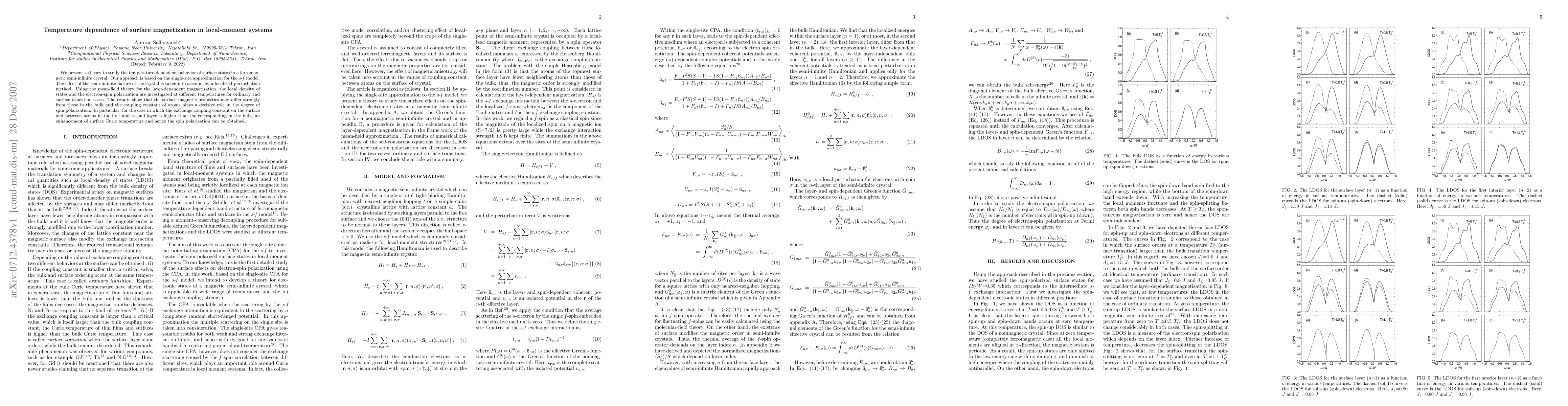 We present a theory to study the temperature-dependent behavior of surface states in a ferromagnetic semi-infinite crystal. Our approach is based on the single-site approximation for the \emph{s-f} model. The effect of the semi-infinite nature of the crystal is taken into account by a localized perturbation method. Using the mean-field theory for the layer-dependent magnetization, the local density of states and the electron-spin polarization are investigated at different temperatures for ordinary and surface transition cases. The results show that the surface magnetic properties may differ strongly from those in the bulk and the coupling constant of atoms plays a decisive role in the degree of spin polarization. In particular, for the case in which the exchange coupling constant on the surface and between atoms in the first and second layer is higher than the corresponding in the bulk, an enhancement of surface Curie temperature and hence the spin polarization can be obtained.