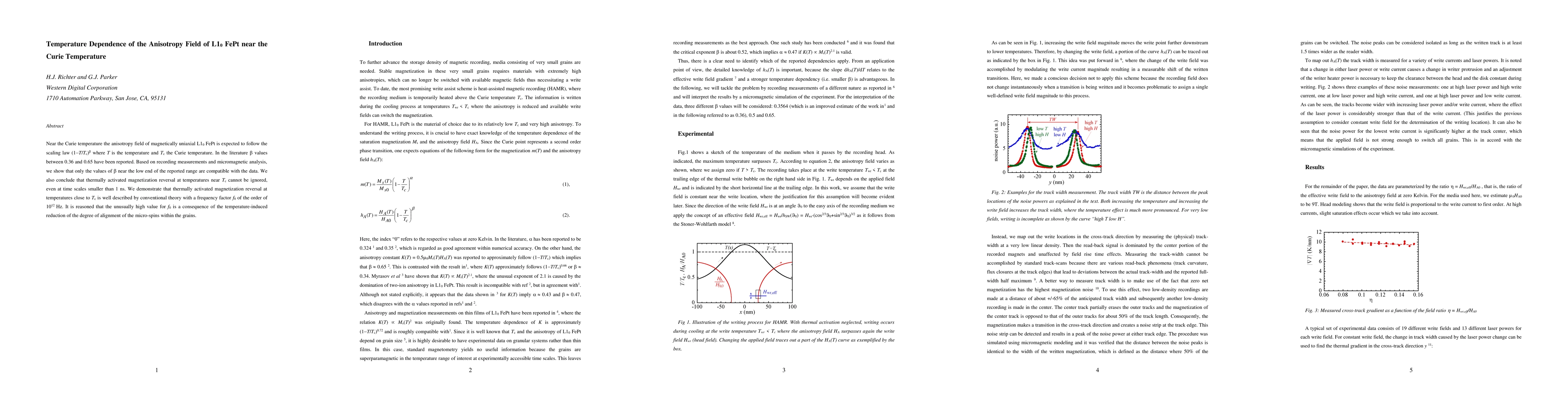 Near the Curie temperature the anisotropy field of magnetically uniaxial L10 FePt is expected to follow the scaling law $(1-T/Tc)^\beta$ where $T$ is the temperature and $T_c$ the Curie temperature. In the literature $\beta$ values between 0.36 and 0.65 have been reported. Based on recording measurements and micromagnetic analysis, we show that only the values of $\beta$ near the low end of the reported range are compatible with the data. We also conclude that thermally activated magnetization reversal at temperatures near $T_c$ cannot be ignored, even at time scales smaller than 1 ns. We demonstrate that thermally activated magnetization reversal at temperatures close to $T_c$ is well described by conventional theory with a frequency factor $f_0$ of the order of $10^{12}$ Hz. It is reasoned that the unusually high value for $f_0$ is a consequence of the temperature-induced reduction of the degree of alignment of the micro-spins within the grains.