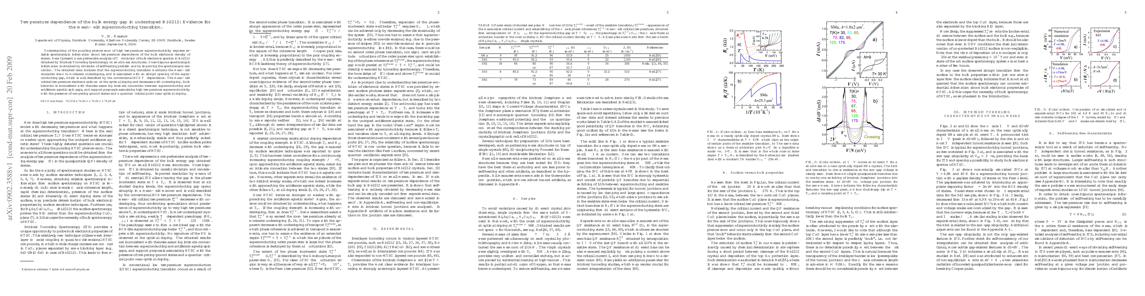 Understanding of the puzzling phenomenon of high temperature superconductivity requires reliable spectroscopic information about temperature dependence of the bulk electronic density of states. Here I present a comprehensive analysis of $T-$evolution of bulk electronic spectra in Bi-2212 obtained by Intrinsic Tunneling Spectroscopy on small mesa structures. Unambiguous spectroscopic information is obtained by obviation of self-heating problem and by improving the spectroscopic resolution. The obtained data indicate that the superconducting transition maintains the mean-field character down to moderate underdoping, and is associated with an abrupt opening of the superconducting gap, which is well described by the conventional BCS $T-$dependence. The mean-field critical temperature reaches maximum at the optimal doping and decreases with underdoping. Such behavior is inconsistent with theories assuming intimate connection between superconducting and antiferromagnetic spin gaps, and support proposals associating high temperature superconductivity with the presence of competing ground states and a quantum critical point near optimal doping.