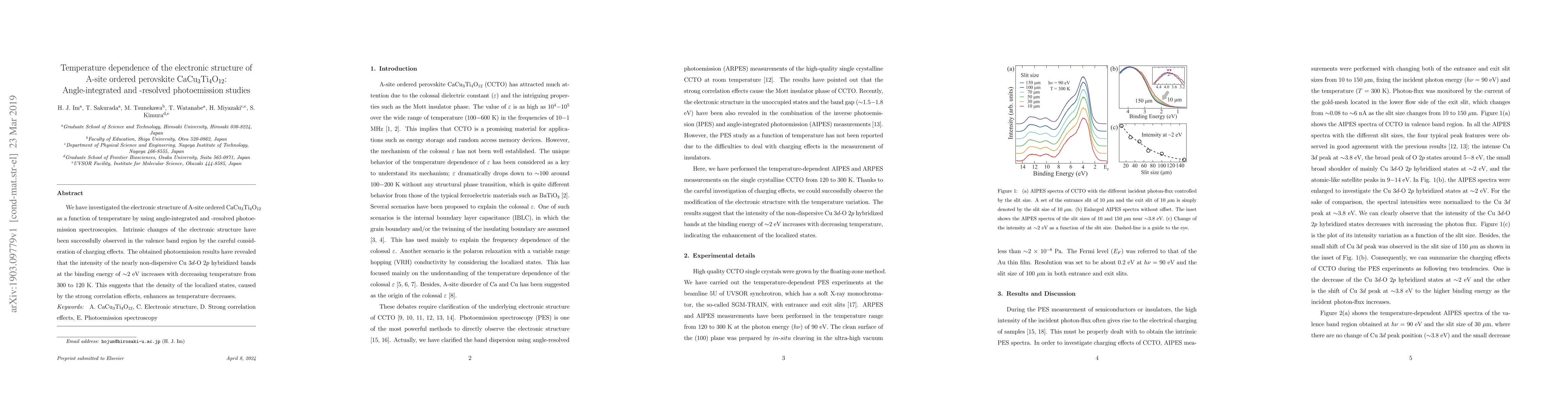 This study uses angle-integrated and -resolved photoemission to investigate the temperature dependence of CaCu$_3$Ti$_4$O$_{12}$. Results show an increase in the intensity of Cu 3$d$-O 2$p$ hybridized bands with decreasing temperature, indicating enhanced density of localized states due to strong correlation effects.