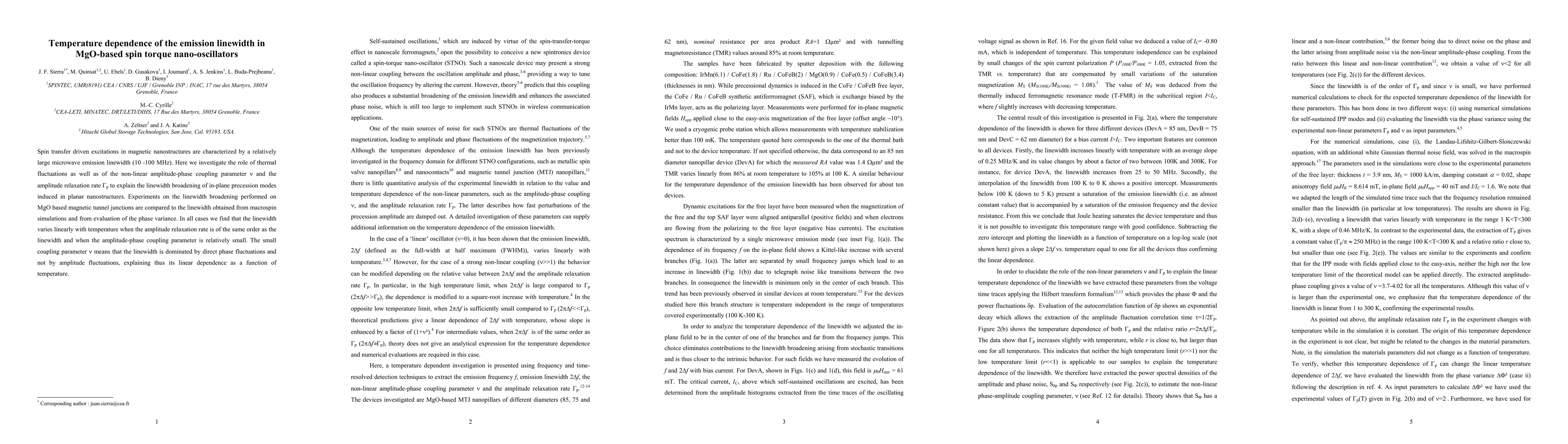 The paper investigates temperature dependence of microwave emission linewidth in MgO-based spin torque nano-oscillators, finding a linear relationship between linewidth and temperature when amplitude relaxation rate is comparable to the linewidth.