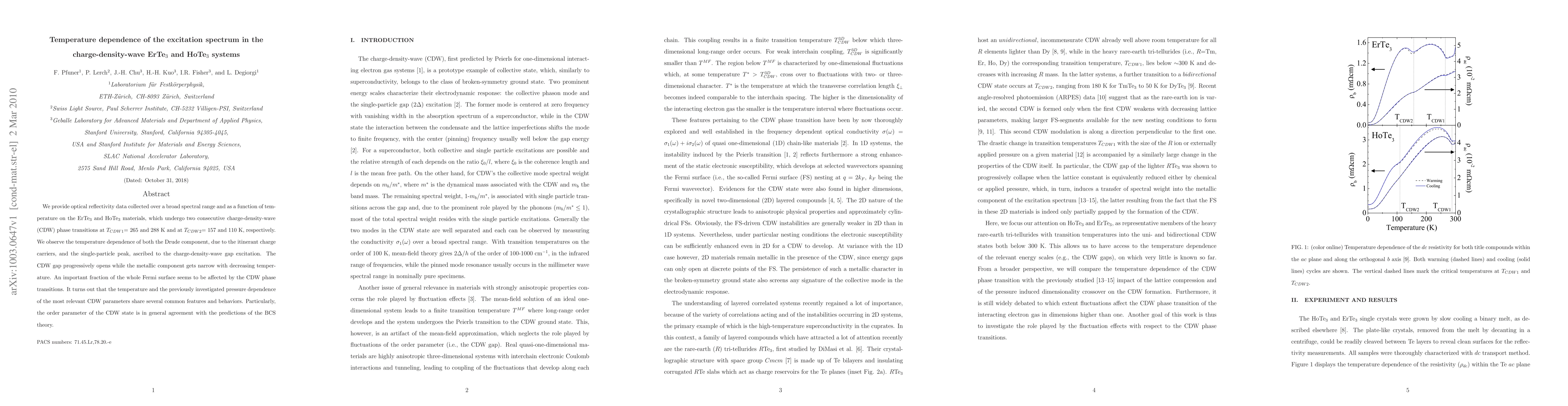This study investigates the temperature dependence of the excitation spectrum in ErTe$_3$ and HoTe$_3$ materials undergoing charge-density-wave phase transitions. Optical reflectivity data reveal changes in both the Drude component and the charge-density-wave gap, indicating significant Fermi surface modifications during the transitions.