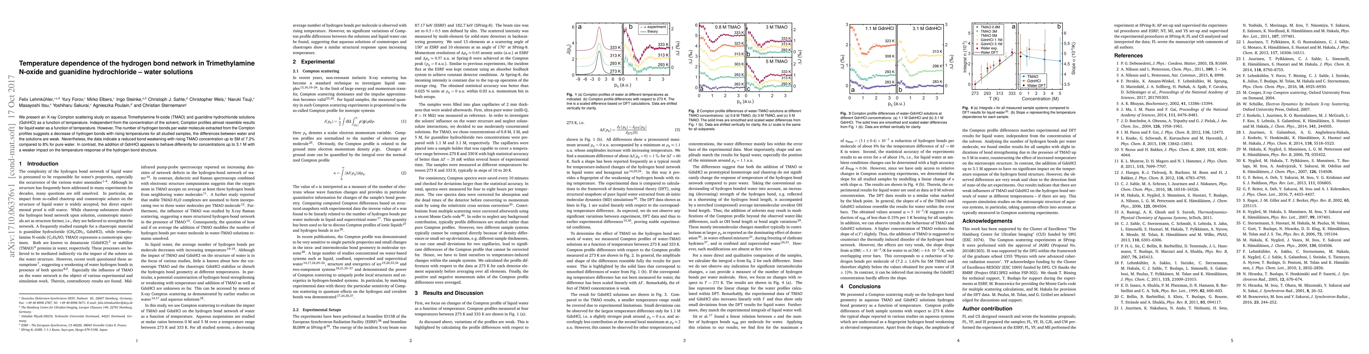 We present an X-ray Compton scattering study on aqueous Trimethylamine N-oxide (TMAO) and guanidine hydrochloride solutions (GdnHCl) as a function of temperature. Independent from the concentration of the solvent, Compton profiles almost resemble results for liquid water as a function of temperature. However, The number of hydrogen bonds per water molecule extracted from the Compton profiles suggests a decrease of hydrogen bonds with rising temperatures for all studied samples, the differences between water and the solutions are weak. Nevertheless, the data indicate a reduced bond weakening with rising TMAO concentration up to 5M of 7.2% compared to 8 % for pure water. In contrast, the addition of GdnHCl appears to behave differently for concentrations up to 3.1 M with a weaker impact on the temperature response of the hydrogen bond structure.