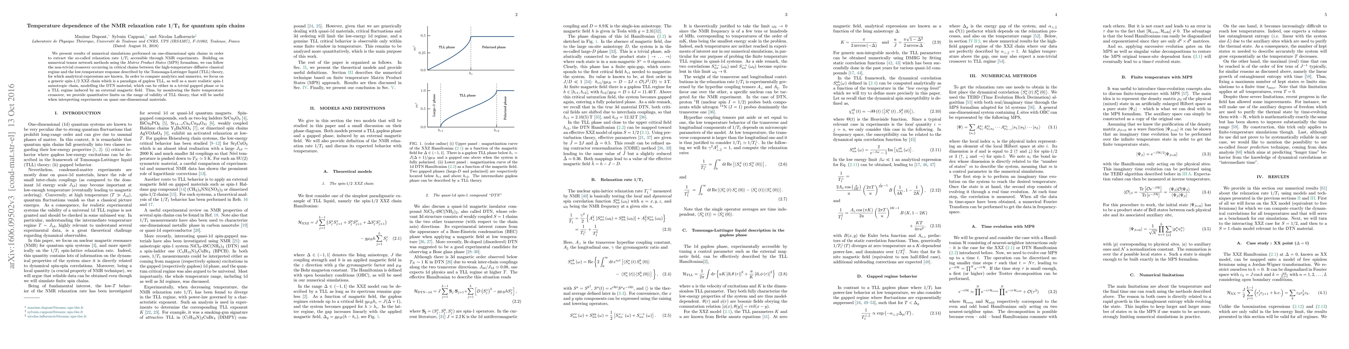 This paper uses numerical tensor network methods to simulate one-dimensional spin chains, focusing on the temperature dependence of the NMR relaxation rate $1/T_1$. The study compares the high-temperature classical regime with the low-temperature Tomonaga-Luttinger liquid behavior, providing insights into the crossover and validating TLL theory for quasi one-dimensional materials.
