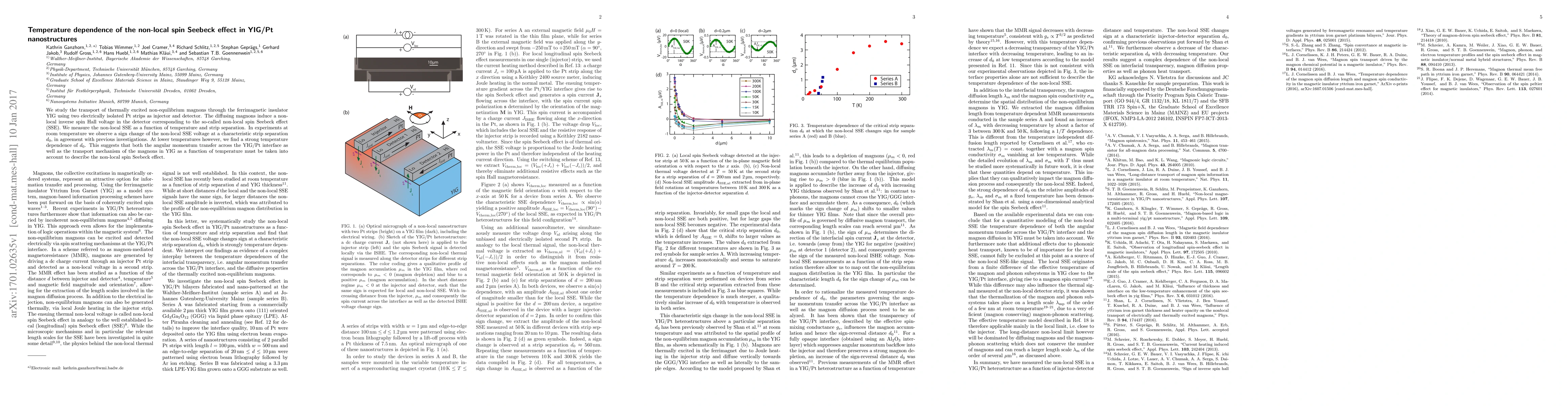 This study investigates the temperature dependence of the non-local spin Seebeck effect in YIG/Pt nanostructures, finding a sign change in the effect at a characteristic separation at room temperature. At lower temperatures, a strong temperature dependence of this separation is observed, indicating that both interface angular momentum transfer and magnon transport mechanisms vary with temperature.