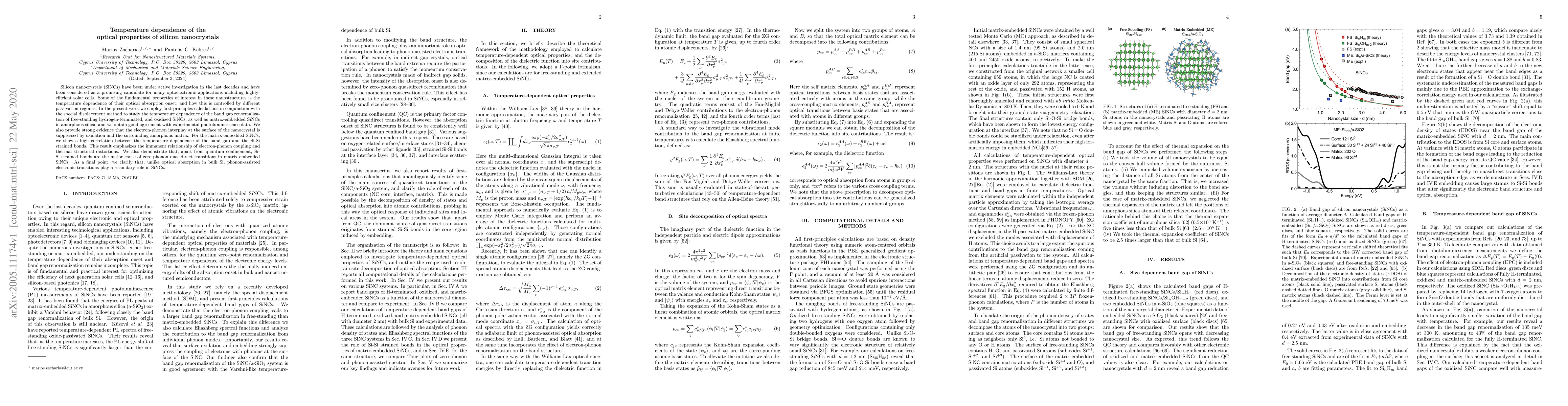 This paper investigates the temperature dependence of optical properties in silicon nanocrystals (SiNCs) using first-principles calculations and special displacement methods. It finds that oxidation and surrounding amorphous silica suppress electron-phonon interactions at the nanocrystal surface, while Si-Si strained bonds significantly influence the temperature dependence of the band gap and zero-phonon transitions in matrix-embedded SiNCs.