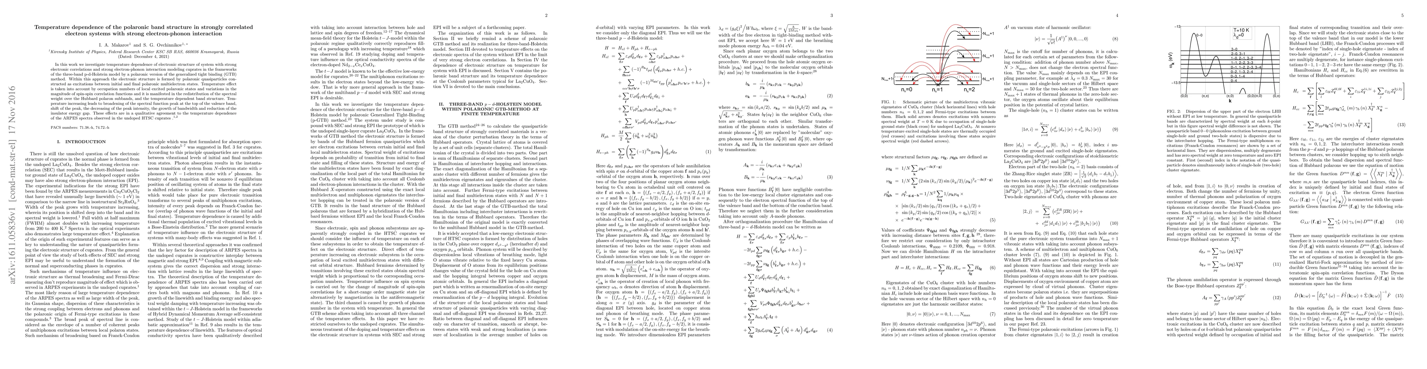 In this work we investigate temperature dependence of electronic structure of system with strong electronic correlations and strong electron-phonon interaction modeling cuprates in the frameworks of the three-band p-d-Holstein model by a polaronic version of the generalized tight binding (GTB) method. Within this approach the electronic structure is formed by polaronic quasiparticles constructed as excitations between initial and final polaronic multielectron states. Temperature effect is taken into account by occupation numbers of local excited polaronic states and variations in the magnitude of spin-spin correlation functions and it is manifested in the redistribution of the spectral weight over the Hubbard polaron subbands, and the temperature dependent band structure. Temperature increasing leads to broadening of the spectral function peak at the top of the valence band, shift of the peak, the decreasing of the peak intensity, the growth of bandwidth and reduction of the insulator energy gap. These effects are in a qualitative agreement to the temperature dependence of the ARPES spectra observed in the undoped HTSC cuprates.