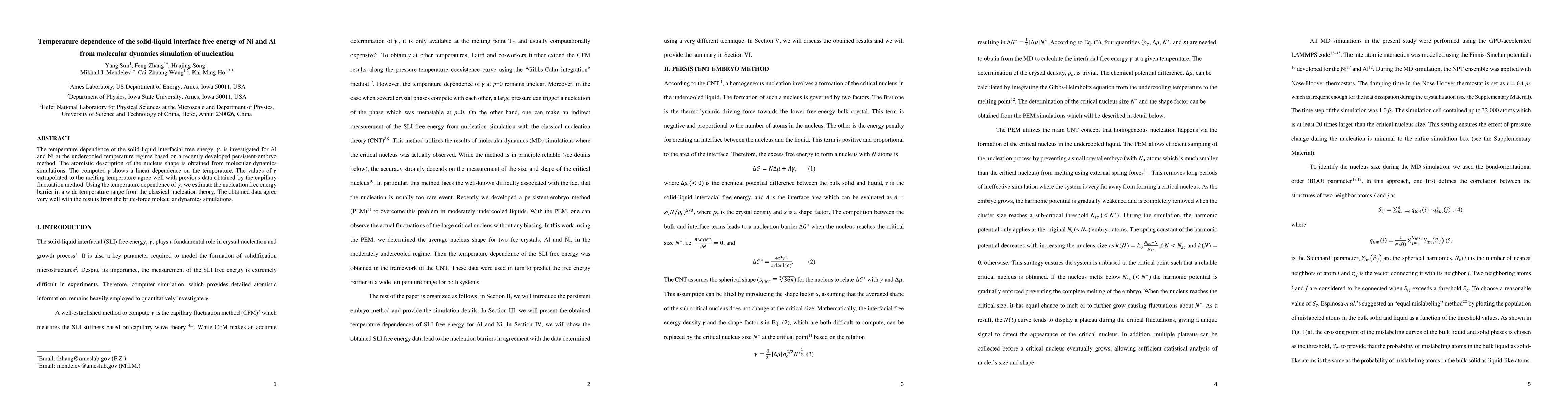 This study investigates the temperature dependence of the solid-liquid interfacial free energy (\gamma) for Al and Ni using molecular dynamics simulations and a persistent-embryo method. The results show a linear temperature dependence, and the extrapolated values align well with previous capillary fluctuation method data.