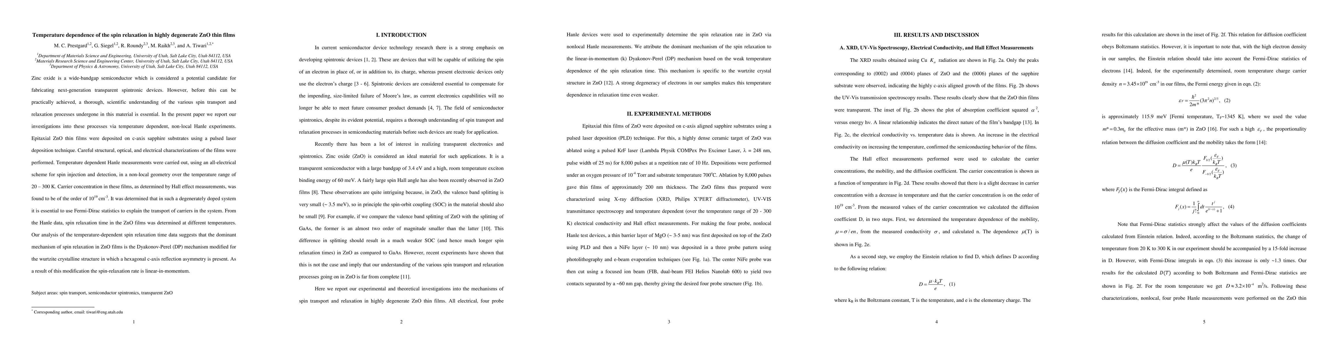 This study investigates the temperature dependence of spin relaxation in highly degenerate ZnO thin films using non-local Hanle experiments. The findings suggest that the dominant spin relaxation mechanism is the Dyakonov-Perel mechanism modified for the wurtzite structure, resulting in a linear-in-momentum spin-relaxation rate.