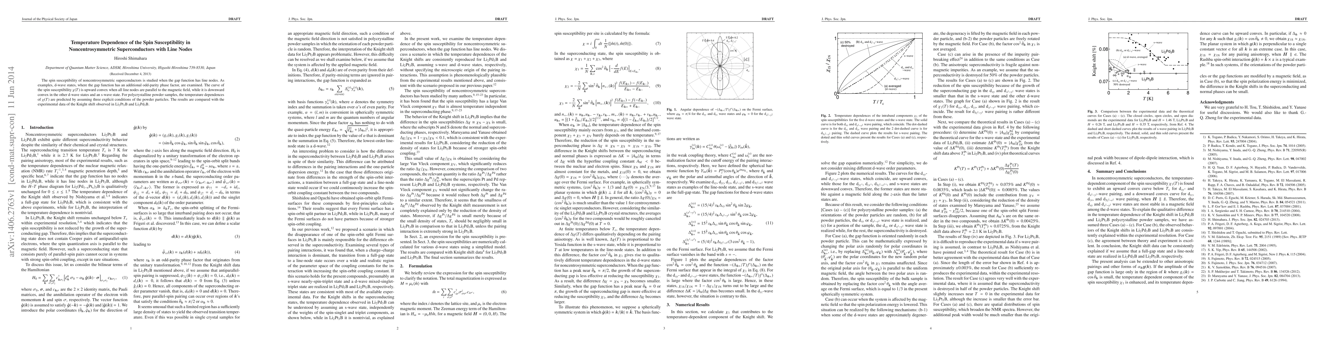 This paper investigates the temperature dependence of spin susceptibility in noncentrosymmetric superconductors with line nodes in the gap function, particularly focusing on d-wave states. It finds that the spin susceptibility curve is upward convex when line nodes align with the magnetic field, contrasting with downward convexity in other d-wave and s-wave states. The study also predicts $\chi(T)$ for polycrystalline samples under specific conditions and compares these predictions with experimental Knight shift data from Li_2Pt_3B and Li_2Pd_3B.
