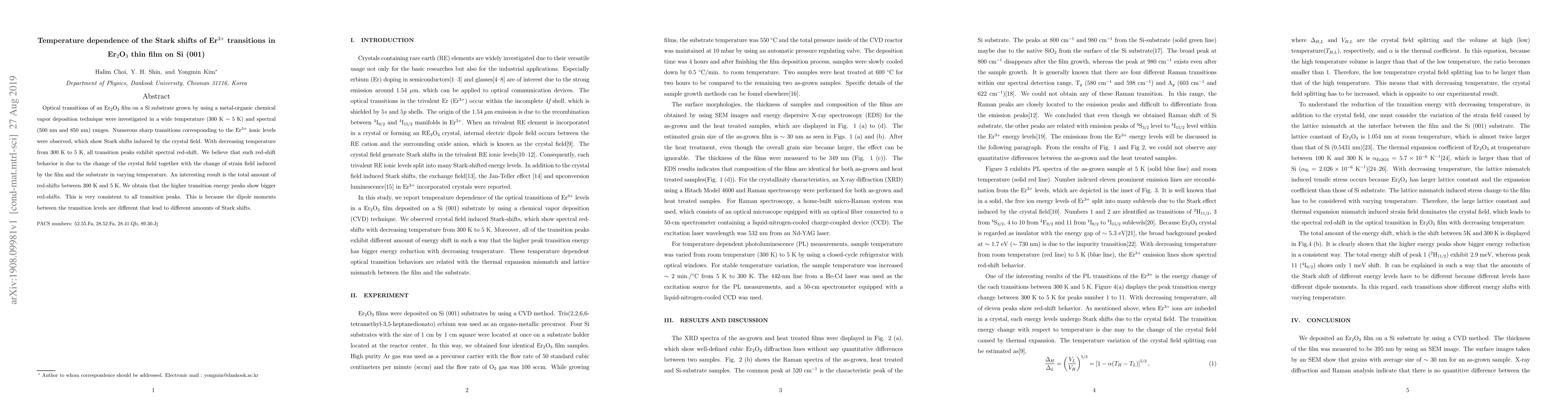 The research investigates Er^3+ transitions in Er_2O_3 thin film on Si (001), observing red-shifts in spectral peaks with decreasing temperature. This shift is attributed to changes in crystal and strain fields, with higher energy peaks showing larger red-shifts due to varying dipole moments and Stark effects.