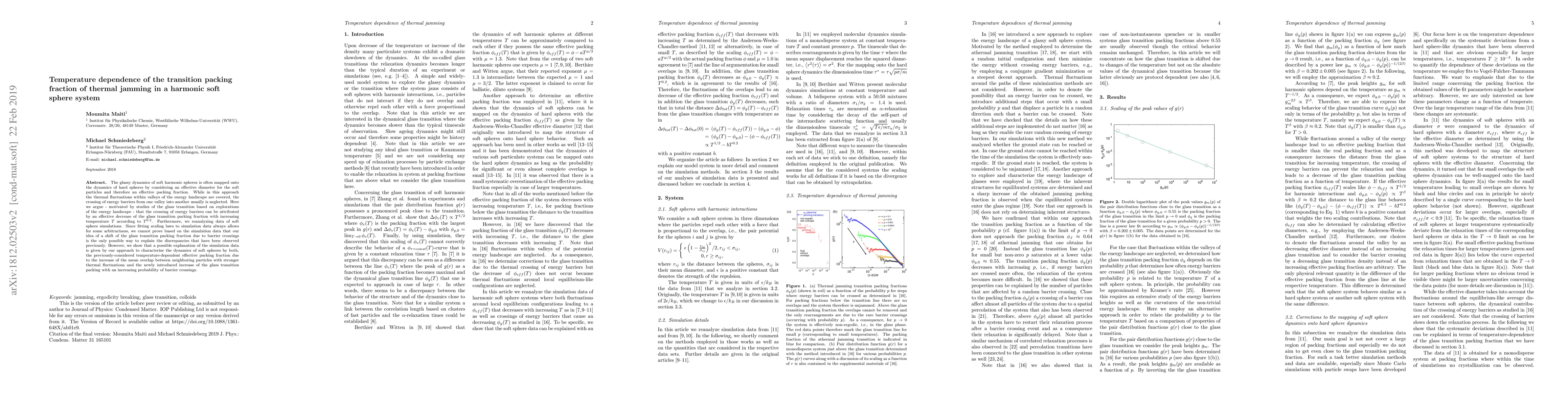 This paper investigates the temperature dependence of the transition packing fraction in soft harmonic spheres, proposing that thermal fluctuations lead to an effective decrease in the glass transition packing fraction as T^0.2. The authors suggest that barrier crossings between energy valleys contribute to this shift, providing a new perspective on the dynamics of soft spheres.