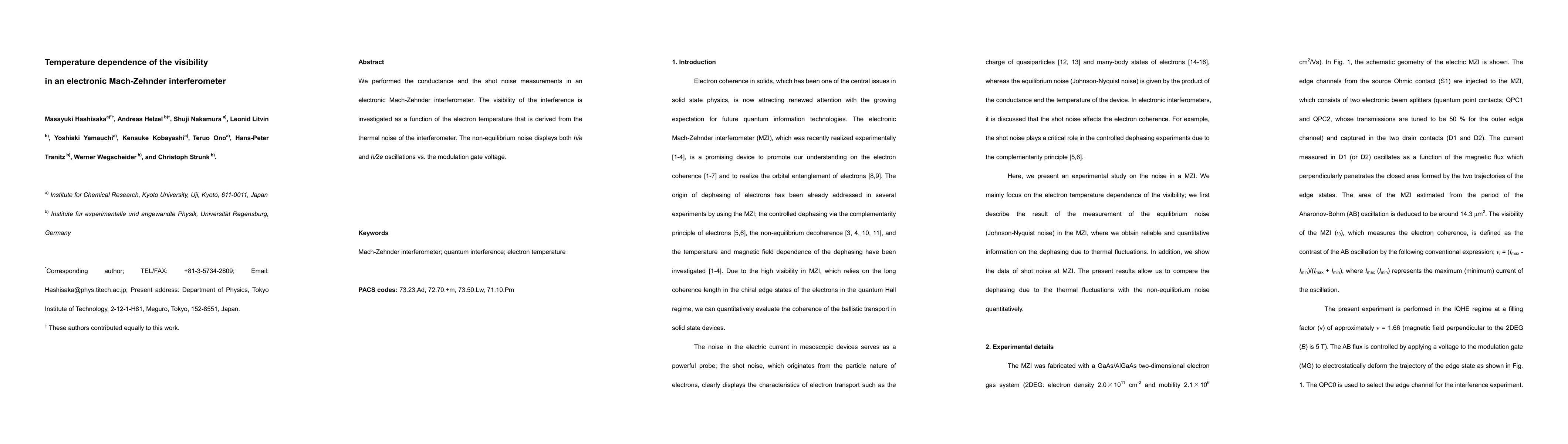 Summary: This study investigates the temperature dependence of interference visibility in an electronic Mach-Zehnder interferometer through conductance and shot noise measurements. The visibility varies with electron temperature, showing both h/e and h/2e oscillations in non-equilibrium noise as a function of modulation gate voltage.