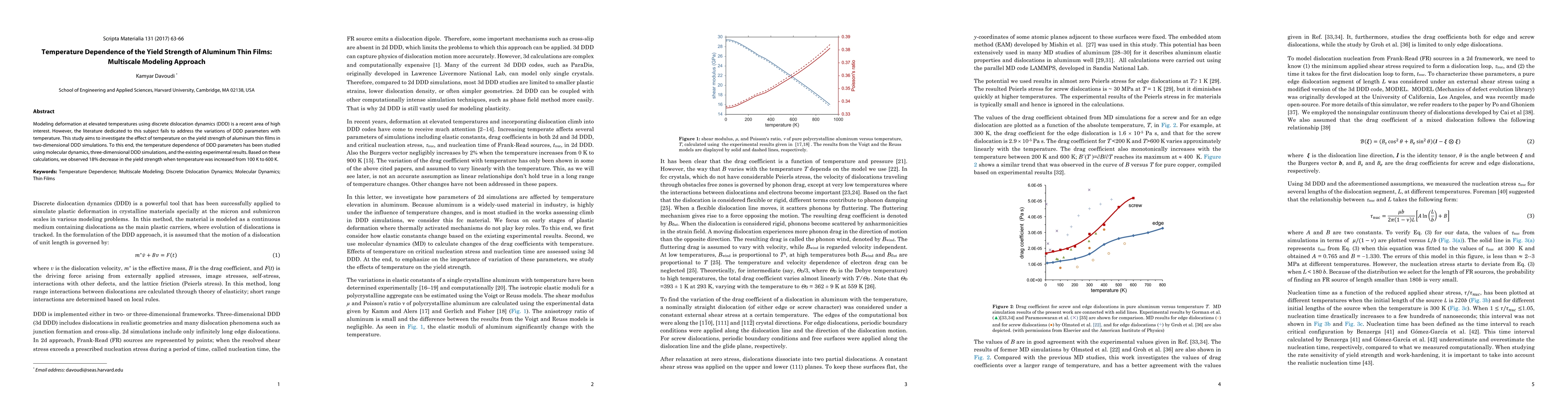 A study investigates how temperature affects the yield strength of aluminum thin films using multiscale modeling, finding a 18% decrease in yield strength when temperature is increased from 100 K to 600 K.