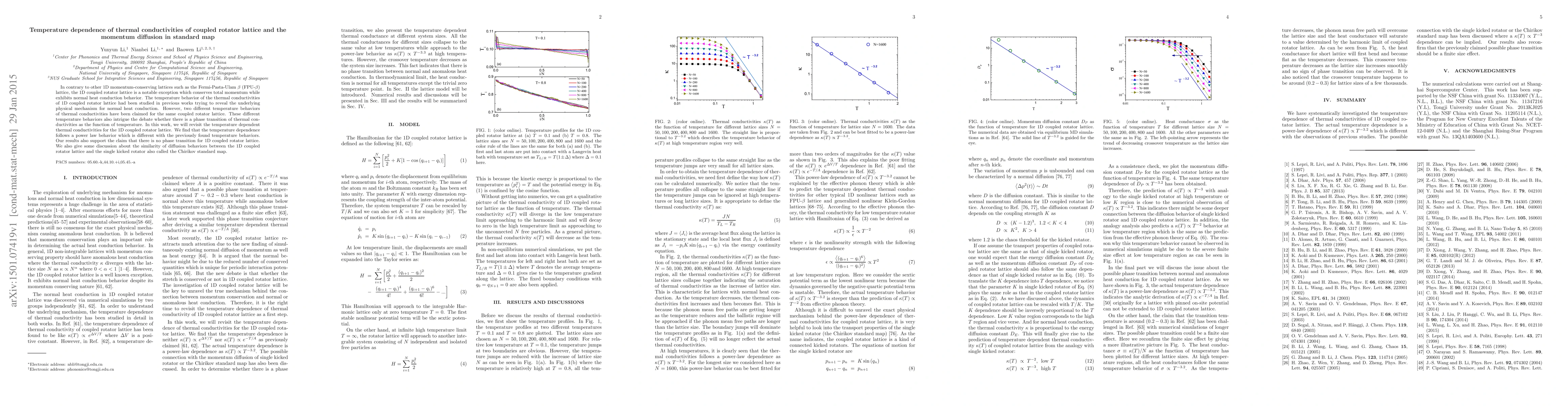 The paper investigates temperature dependence of thermal conductivities in a 1D coupled rotator lattice, finding power law behavior that contradicts previous claims of phase transitions.