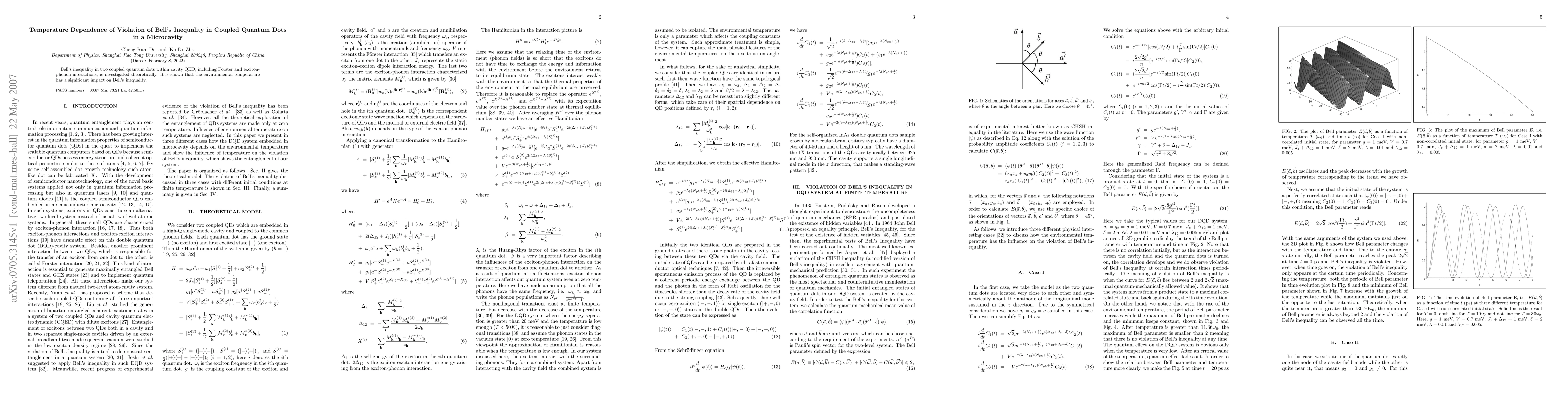 This paper theoretically investigates how the environmental temperature affects Bell's inequality in two coupled quantum dots within a microcavity, considering Forster and exciton-phonon interactions, and finds that temperature significantly influences the violation of Bell's inequality.