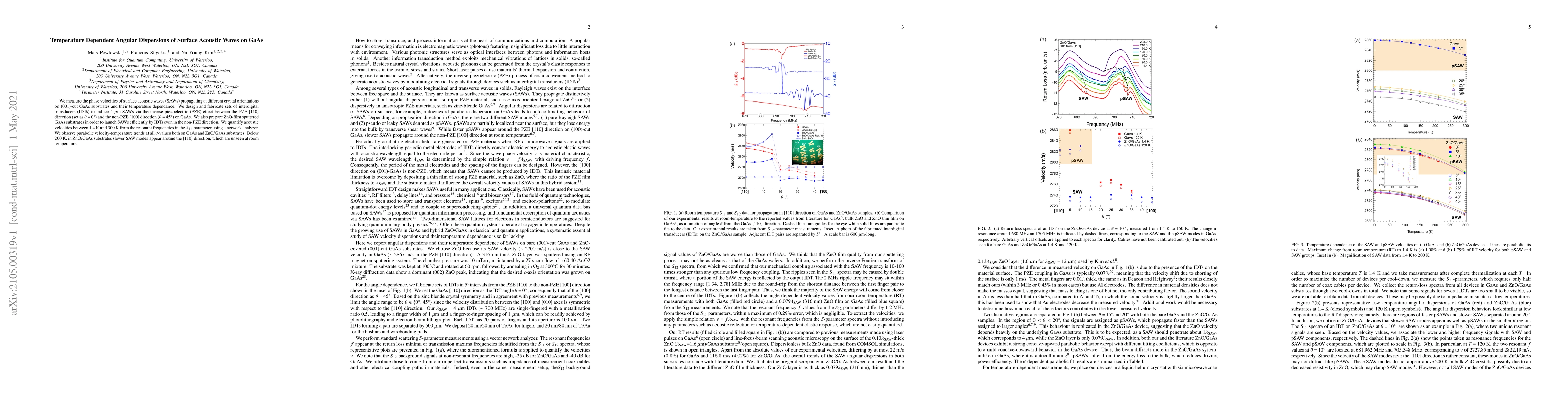 We measure the phase velocities of surface acoustic waves (SAWs) propagating at different crystal orientations on (001)-cut GaAs substrates and their temperature dependance. We design and fabricate sets of interdigital transducers (IDTs) to induce 4 {\mu}m SAWs via the inverse piezoelectric (PZE) effect between the PZE [110] direction (set as {\theta} = 0{\deg}) and the non-PZE [100] direction ({\theta} = 45{\deg}) on GaAs. We also prepare ZnO film sputtered GaAs substrates in order to launch SAWs efficiently by IDTs even in the non-PZE direction. We quantify acoustic velocities between 1.4 and 300 K from the resonant frequencies in the S11 parameter using a network analyzer. We observe parabolic velocity-temperature trends at all {\theta}-values both on GaAs and ZnO/GaAs substrates. Below 200 K, in ZnO/GaAs substrates slower SAW modes appear around the [110] direction, which are unseen at RT.