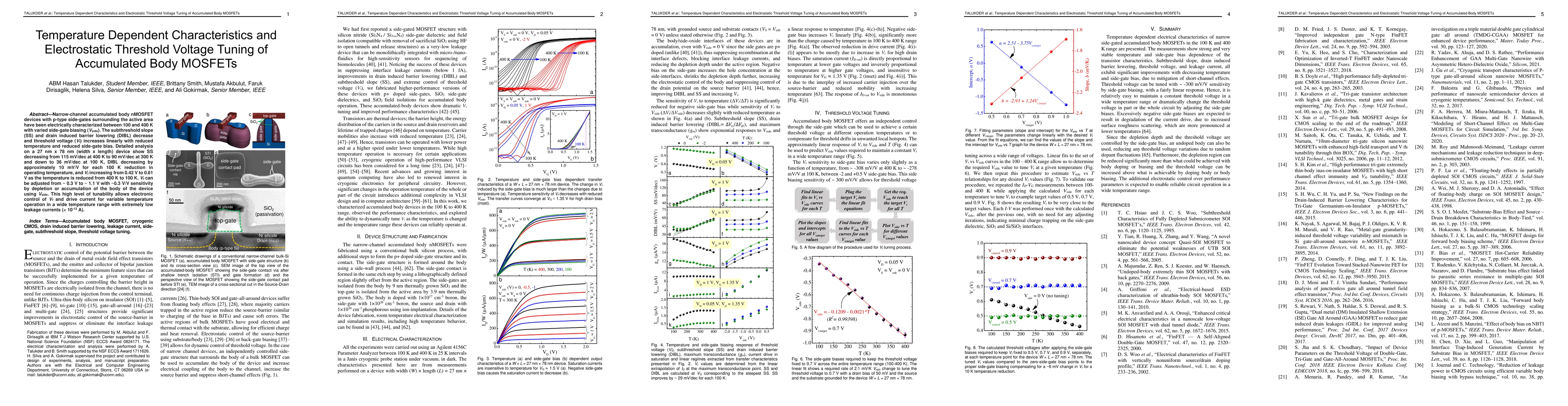 Narrow-channel accumulated body nMOSFET devices with p-type side-gates surrounding the active area have been electrically characterized between 100 and 400 K with varied side-gate biasing (Vside). The subthreshold slope (SS) and drain induced barrier lowering (DIBL) decrease and threshold voltage (Vt) increases linearly with reduced temperature and reduced side-gate bias. Detailed analysis on a 27 nm x 78 nm (width x length) device show SS decreasing from 115 mV/dec at 400 K to 90 mV/dec at 300 K and down to 36 mV/dec at 100 K, DIBL decreasing by approximately 10 mV/V for each 100 K reduction in operating temperature, and Vt increasing from 0.42 V to 0.61 V as the temperature is reduced from 400 K to 100 K. Vt can be adjusted from ~ 0.3 V to ~ 1.1 V with ~0.3 V/V sensitivity by depletion or accumulation of the body of the device using Vside. This high level of tunability allows electronic control of Vt and drive current for variable temperature operation in a wide temperature range with extremely low leakage currents (< 10-13 A).