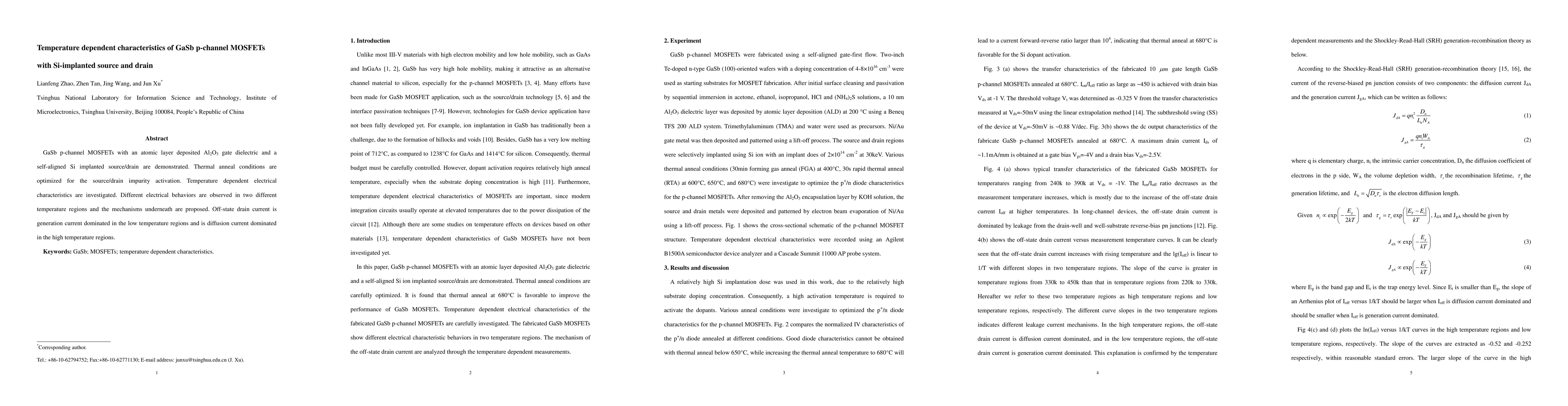 This paper investigates GaSb p-channel MOSFETs with Si-implanted source/drain and Al2O3 gate dielectric, optimizing thermal anneal conditions for impurity activation. It reveals distinct electrical behaviors in low and high temperature regions, attributing off-state drain current to generation current at low temperatures and diffusion current at high temperatures.