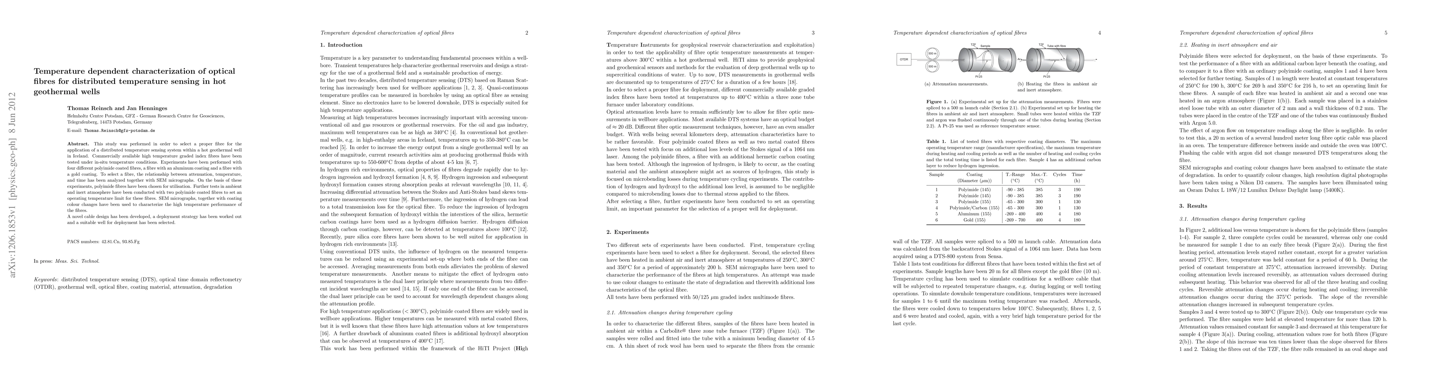 This study was performed in order to select a proper fibre for the application of a distributed temperature sensing system within a hot geothermal well in Iceland. Commercially available high temperature graded index fibres have been tested under in-situ temperature conditions. Experiments have been performed with four different polyimide coated fibres, a fibre with an aluminum coating and a fibre with a gold coating. To select a fibre, the relationship between attenuation, temperature, and time has been analyzed together with SEM micrographs. On the basis of these experiments, polyimide fibres have been chosen for utilisation. Further tests in ambient and inert atmosphere have been conducted with two polyimide coated fibres to set an operating temperature limit for these fibres. SEM micrographs, together with coating colour changes have been used to characterize the high temperature performance of the fibres. A novel cable design has been developed, a deployment strategy has been worked out and a suitable well for deployment has been selected.