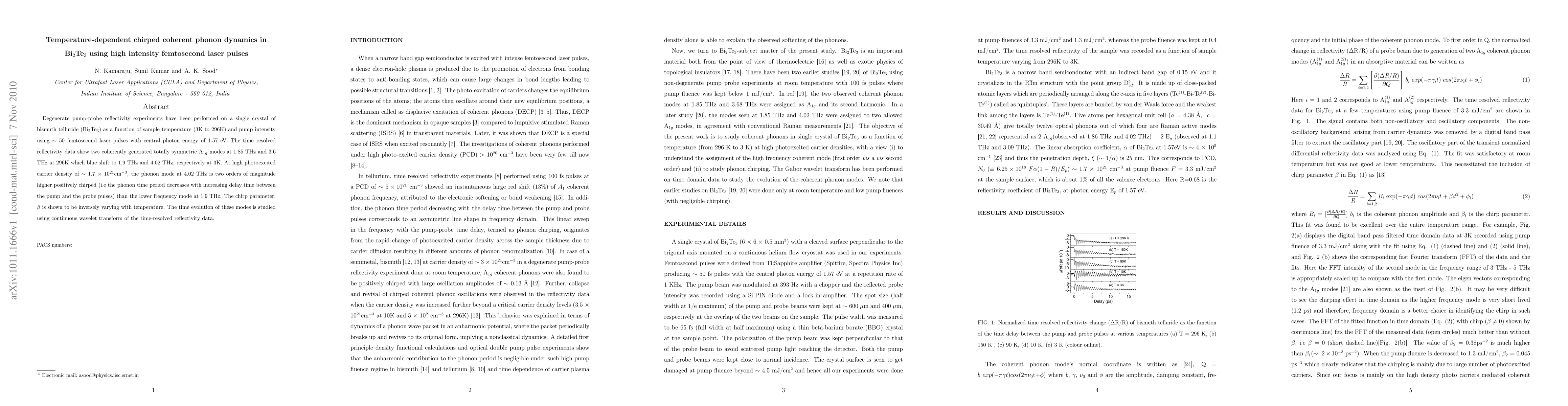Degenerate pump-probe reflectivity experiments have been performed on a single crystal of bismuth telluride (Bi$_2$Te$_3$) as a function of sample temperature (3K to 296K) and pump intensity using $\sim$ 50 femtosecond laser pulses with central photon energy of 1.57 eV. The time resolved reflectivity data show two coherently generated totally symmetric A$_{1g}$ modes at 1.85 THz and 3.6 THz at 296K which blue shift to 1.9 THz and 4.02 THz, respectively at 3K. At high photoexcited carrier density of $\sim$ 1.7 $\times$ 10$^{21}$cm$^{-3}$, the phonon mode at 4.02 THz is two orders of magnitude higher positively chirped (i.e the phonon time period decreases with increasing delay time between the pump and the probe pulses) than the lower frequency mode at 1.9 THz. The chirp parameter, $\beta$ is shown to be inversely varying with temperature. The time evolution of these modes is studied using continuous wavelet transform of the time-resolved reflectivity data.