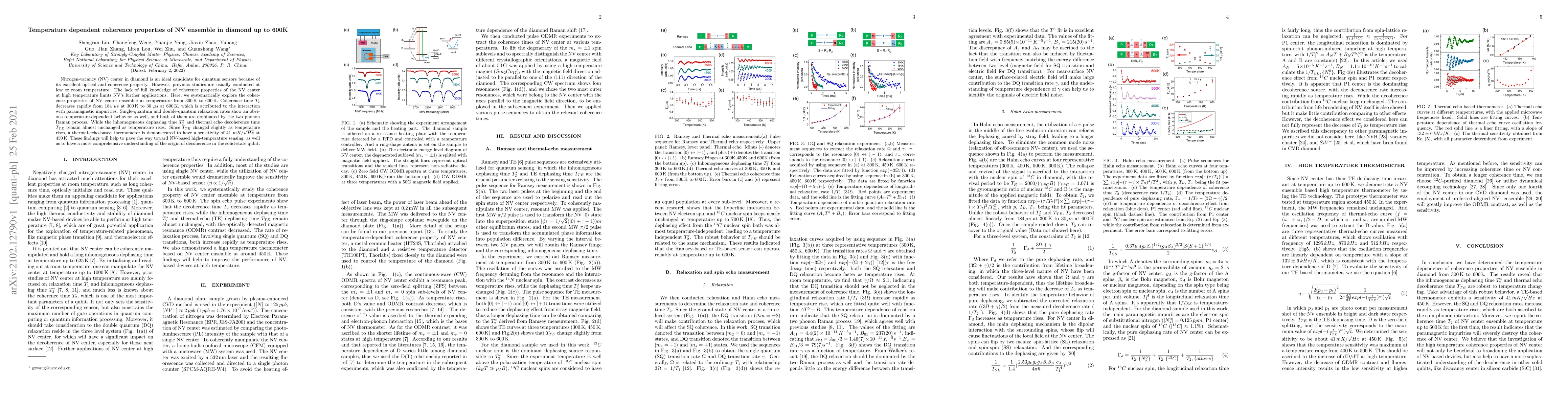 Nitrogen-vacancy (NV) center in diamond is an ideal candidate for quantum sensors because of its excellent optical and coherence property. However, previous studies are usually conducted at low or room temperature. The lack of full knowledge of coherence properties of the NV center at high temperature limits NV's further applications. Here, we systematically explore the coherence properties of the NV center ensemble at temperatures from 300 K to 600 K. Coherence time $T_2$ decreases rapidly from $184 \mu s$ at 300 K to $30 \mu s$ at 600 K, which is attributed to the interaction with paramagnetic impurities. Single-quantum and double-quantum relaxation rates show an obvious temperature-dependent behavior as well, and both of them are dominated by the two phonon Raman process. While the inhomogeneous dephasing time $T_2^*$ and thermal echo decoherence time $T_{TE}$ remain almost unchanged as temperature rises. Since $T_{TE}$ changed slightly as temperature rises, a thermal-echo-based thermometer is demonstrated to have a sensitivity of $41 mK/\sqrt{Hz}$ at 450 K. These findings will help to pave the way toward NV-based high-temperature sensing, as well as to have a more comprehensive understanding of the origin of decoherence in the solid-state qubit.