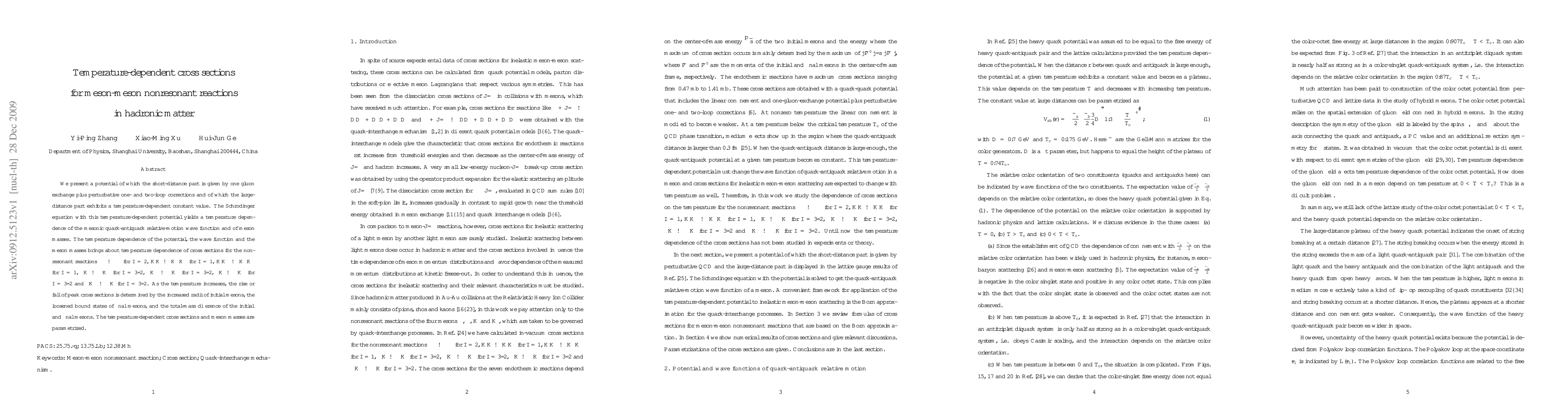 We present a potential of which the short-distance part is given by one gluon exchange plus perturbative one- and two-loop corrections and of which the large-distance part exhibits a temperature-dependent constant value. The Schrodinger equation with this temperature-dependent potential yields a temperature dependence of the mesonic quark-antiquark relative-motion wave function and of meson masses. The temperature dependence of the potential, the wave function and the meson masses brings about temperature dependence of cross sections for the nonresonant reactions pi pi -> rho rho for I=2, KK -> K* K* for I=1, KK* -> K* K* for I=1, pi K -> rho K* for I=3/2, pi K* -> rho K* for I=3/2, rho K -> rho K* for I=3/2 and pi K* -> rho K for I=3/2. As the temperature increases, the rise or fall of peak cross sections is determined by the increased radii of initial mesons, the loosened bound states of final mesons, and the total-mass difference of the initial and final mesons. The temperature-dependent cross sections and meson masses are parametrized.