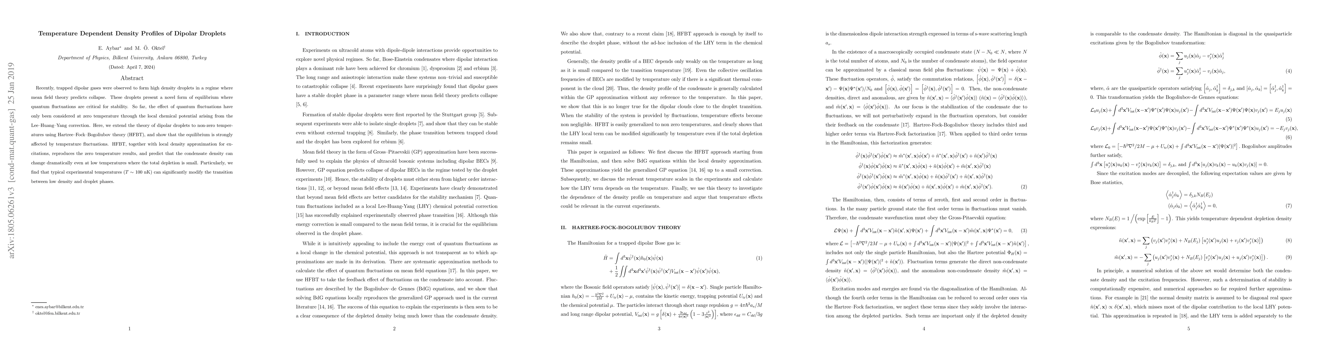 This paper extends the theory of dipolar droplets to non-zero temperatures using Hartree-Fock-Bogoliubov theory, revealing that temperature fluctuations significantly affect the equilibrium density profiles, even at low temperatures, thus altering the transition between low density and droplet phases.
