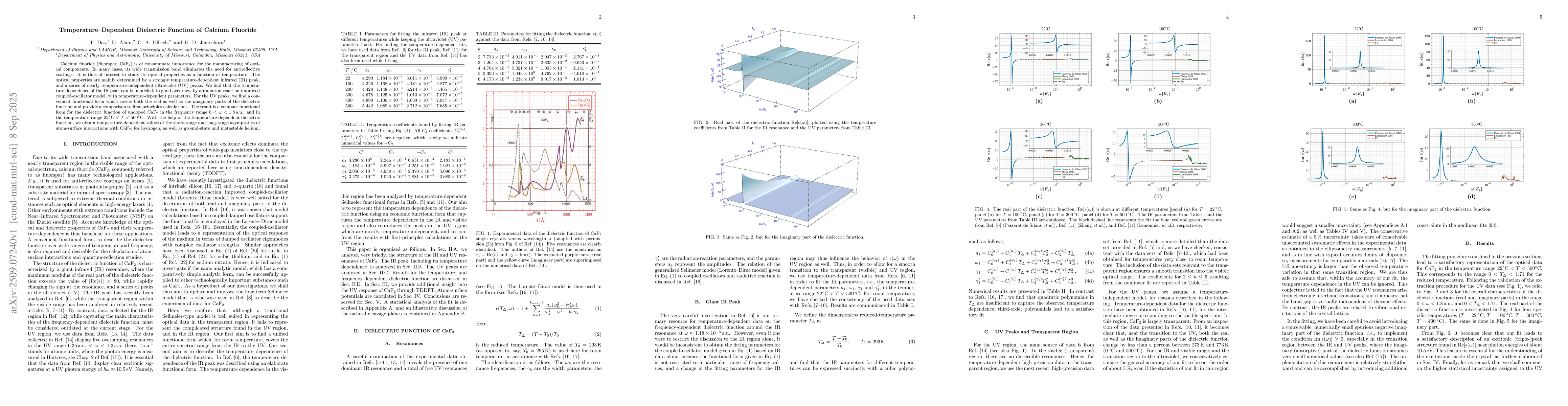 Calcium fluoride (fluorspar, CaF2 ) is of consummate importance for the manufacturing of optical components. In many cases, its wide transmission band eliminates the need for antireflective coatings. It is thus of interest to study its optical properties as a function of temperature. The optical properties are mainly determined by a strongly temperature-dependent infrared (IR) peak, and a series of nearly temperature-independent ultraviolet (UV) peaks. We find that the temperature dependence of the IR peak can be modeled, to good accuracy, by a radiation-reaction improved coupled-oscillator model, with temperature-dependent parameters. For the UV peaks, we find a convenient functional form which covers both the real as well as the imaginary parts of the dielectric function and provide a comparison to first-principles calculations. The result is a compact functional form for the dielectric function of undoped CaF2 in the frequency range 0 < omega < 1.8 a.u., and in the temperature range 22Celsius < T < 500Celsius. With the help of the temperature-dependent dielectric function, we obtain temperature-dependent values of the short-range and long-range asymptotics of atom-surface interactions with CaF2, for hydrogen, as well as ground-state and metastable helium.