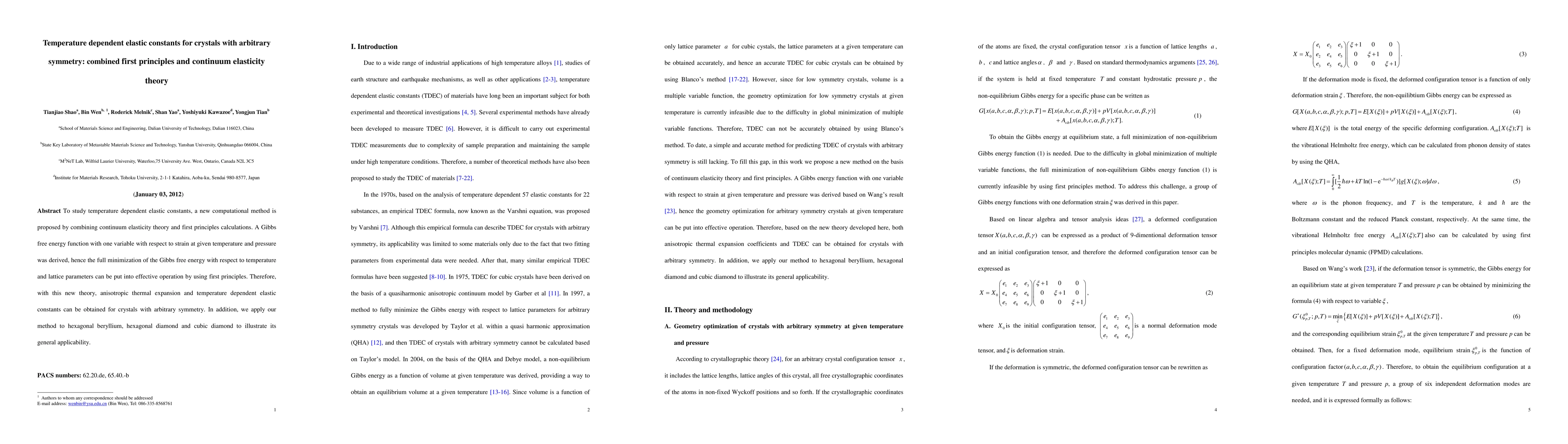 This paper proposes a novel computational method combining continuum elasticity theory and first principles to determine temperature-dependent elastic constants for crystals of any symmetry. The method derives a Gibbs free energy function and applies it to hexagonal beryllium, hexagonal diamond, and cubic diamond to demonstrate its effectiveness.