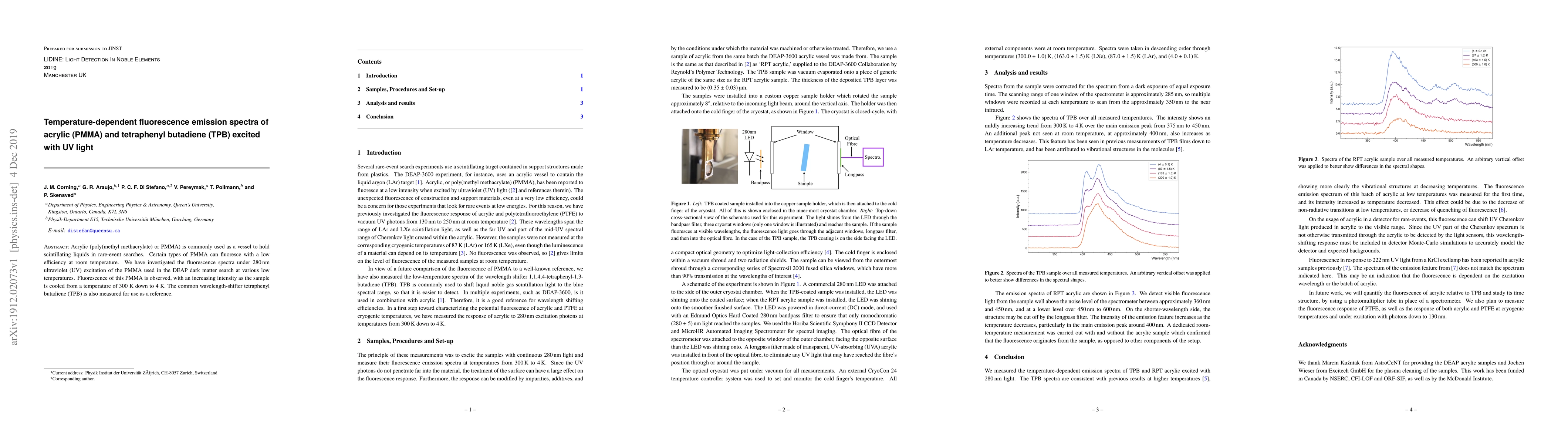 This study investigates the temperature-dependent fluorescence emission spectra of acrylic (PMMA) and tetraphenyl butadiene (TPB) under UV excitation, revealing that PMMA fluorescence intensity increases significantly as temperature decreases from 300K to 4K. TPB is used as a reference for comparison.