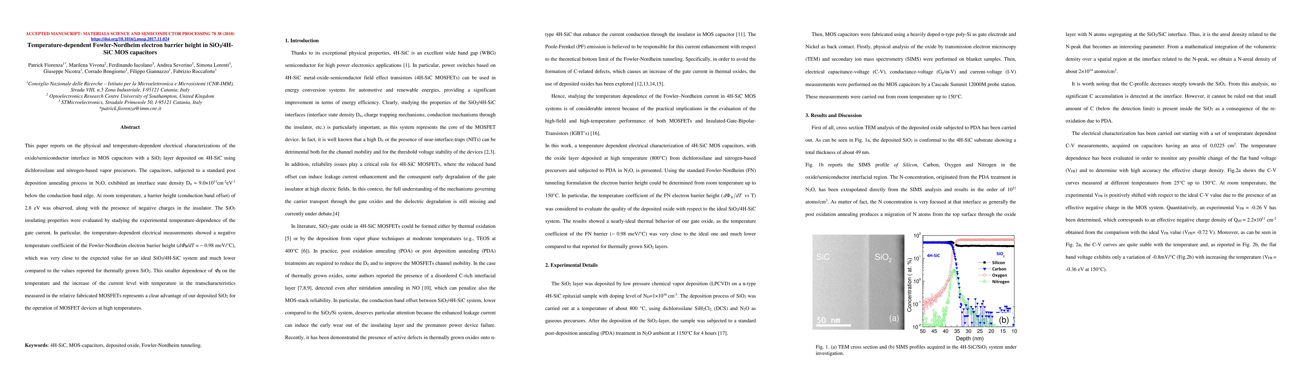 This study investigates the temperature-dependent electrical properties of SiO2/4H-SiC MOS capacitors, revealing a low negative temperature coefficient for the Fowler-Nordheim electron barrier height (dFB/dT = -0.98 meV/°C), indicating a significant advantage for high-temperature MOSFET operation. The interface state density and conduction band offset were also characterized, showing promising insulating properties for the deposited SiO2.