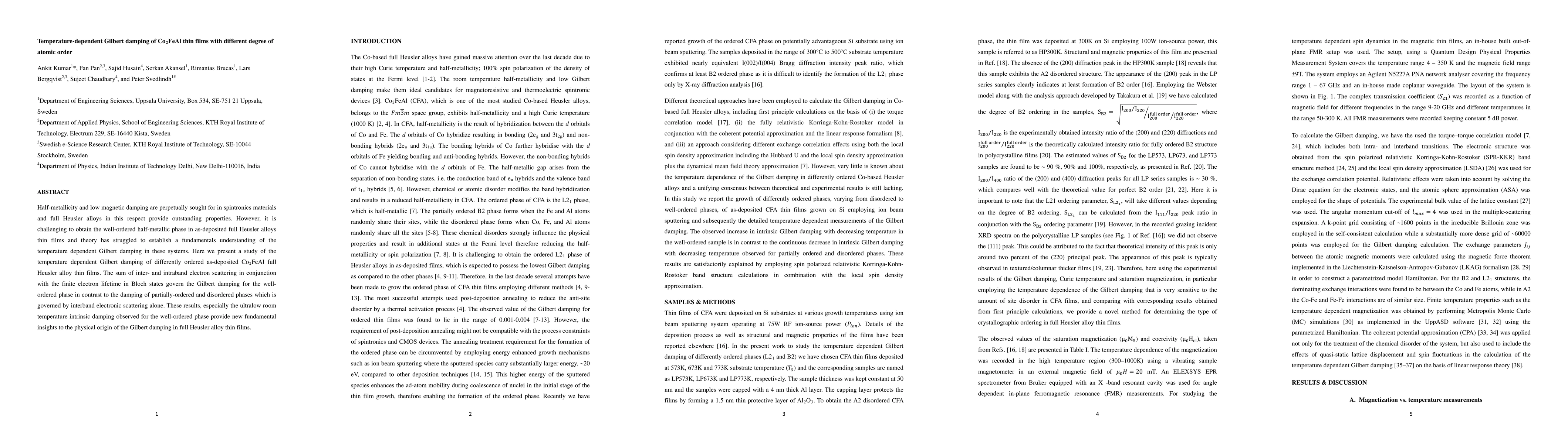 This study investigates the temperature-dependent Gilbert damping in differently ordered Co2FeAl thin films, revealing that well-ordered phases exhibit ultralow intrinsic damping governed by inter- and intraband electron scattering, while partially-ordered and disordered phases are influenced mainly by interband scattering.