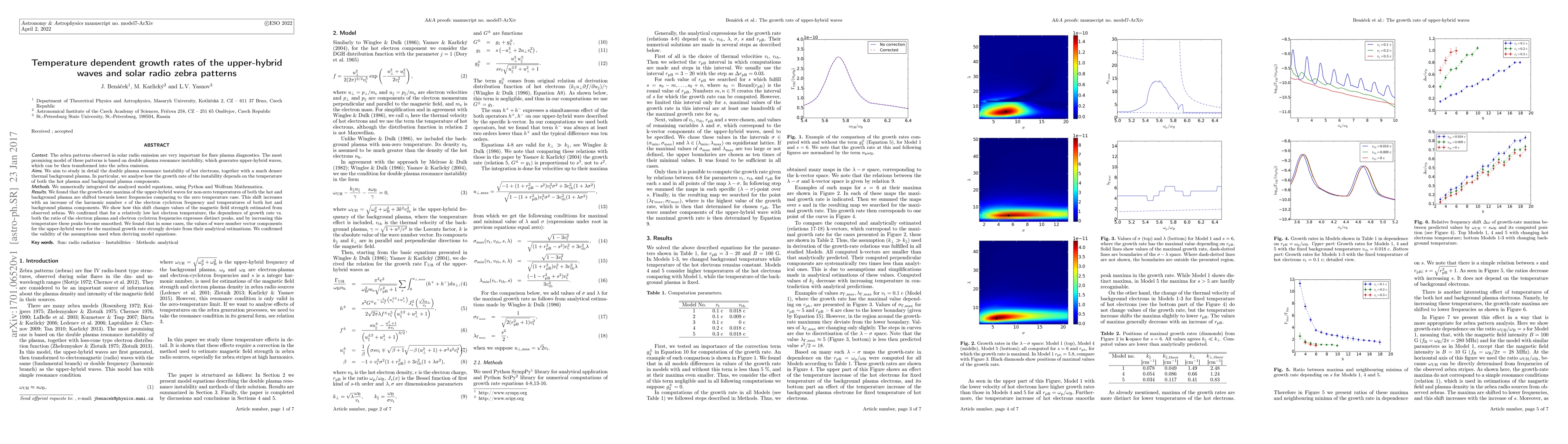 This paper investigates the temperature dependence of the growth rates of upper-hybrid waves and solar radio zebra patterns, finding that temperature shifts the growth-rate maxima towards lower frequencies. The study confirms that increased temperatures smooth distinct peaks in the growth rate vs. frequency ratio, and validates the model equations used.