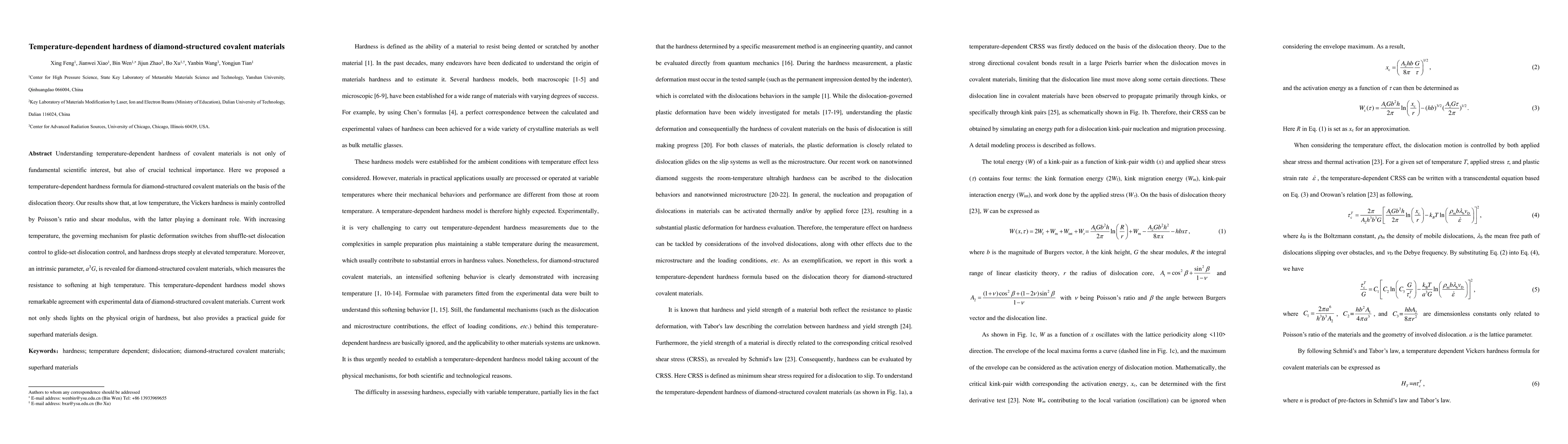 This research constructs a temperature-dependent hardness formula for diamond-structured covalent materials based on dislocation theory, revealing that low-temperature hardness is dominated by shear modulus, while high-temperature hardness drops due to a transition in plastic deformation mechanisms. The study introduces an intrinsic parameter a3G to measure resistance to softening at high temperatures.