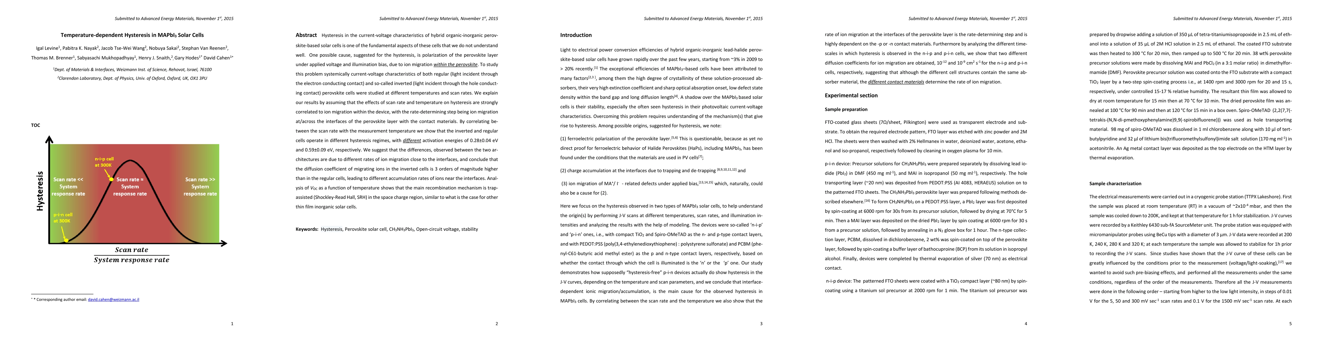 Hysteresis in the current-voltage characteristics of hybrid organic-inorganic perovskite-based solar cells is one of the fundamental aspects of these cells that we do not understand well. One possible cause, suggested for the hysteresis, is polarization of the perovskite layer under applied voltage and illumination bias, due to ion migration within the perovskite. To study this problem systemically current-voltage characteristics of both regular (light incident through the electron conducting contact) and so-called inverted (light incident through the hole conducting contact) perovskite cells were studied at different temperatures and scan rates. We explain our results by assuming that the effects of scan rate and temperature on hysteresis are strongly correlated to ion migration within the device, with the rate-determining step being ion migration at/across the interfaces of the perovskite layer with the contact materials. By correlating between the scan rate with the measurement temperature we show that the inverted and regular cells operate in different hysteresis regimes, with different activation energies of 0.28+-0.04 eV and 0.59+-0.09 eV, respectively. We suggest that the differences, observed between the two architectures are due to different rates of ion migration close to the interfaces, and conclude that the diffusion coefficient of migrating ions in the inverted cells is 3 orders of magnitude higher than in the regular cells, leading to different accumulation rates of ions near the interfaces. Analysis of VOC as a function of temperature shows that the main recombination mechanism is trap-assisted (Shockley-Read Hall, SRH) in the space charge region, similar to what is the case for other thin film inorganic solar cells.
