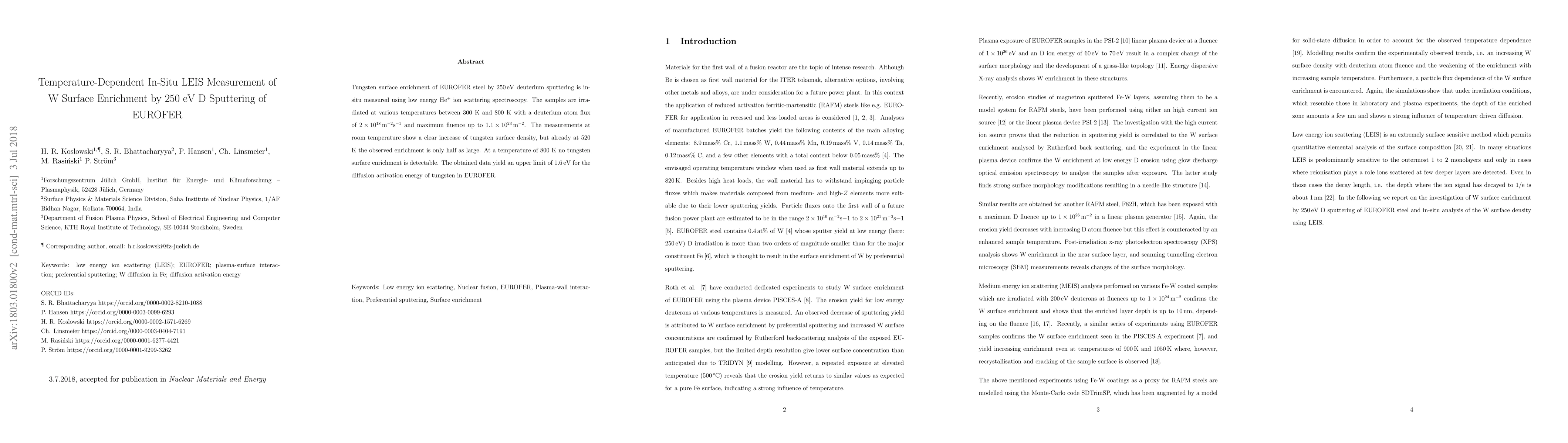 This study investigates tungsten surface enrichment on EUROFER steel via 250 eV deuterium sputtering using in-situ low energy ion scattering. Results show significant tungsten enrichment at room temperature, which diminishes with increasing temperature, indicating no enrichment at 800 K and suggesting a diffusion activation energy upper limit of 1.6 eV.