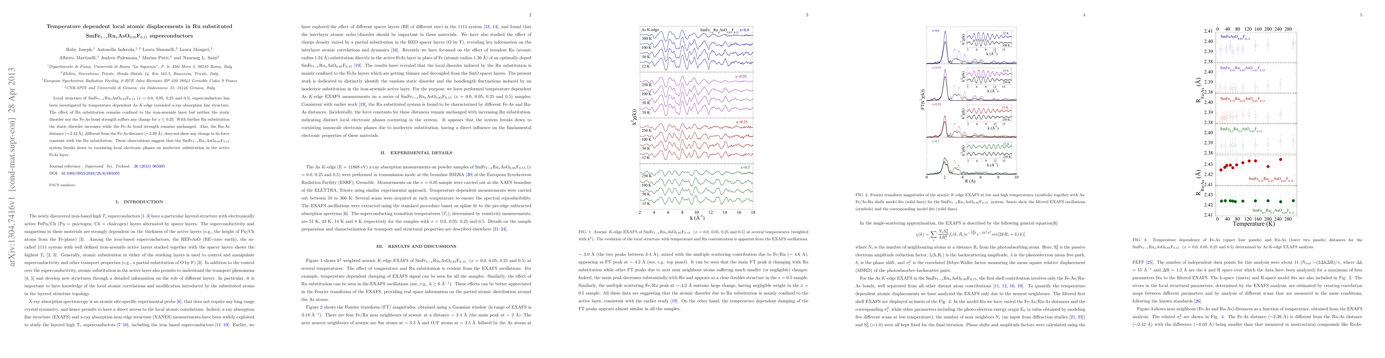 This paper investigates the local atomic displacements in Ru-substituted SmFe$_{1-x}$Ru$_x$AsO$_{0.85}$F$_{0.15}$ superconductors using temperature-dependent As K-edge extended x-ray absorption fine structure. The study finds that Ru substitution affects the iron-arsenide layer without altering Fe-As bond strength until $x$ ≤ 0.25, after which static disorder increases but bond strength remains unchanged.