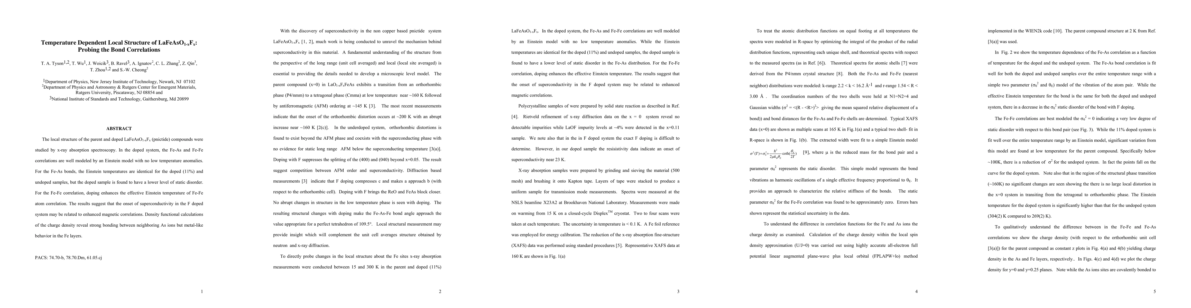 The local structure of the parent and doped LaFeAsO1-xFx (pnictide) compounds were studied by x-ray absorption spectroscopy. In the doped system, the Fe-As and Fe-Fe correlations are well modeled by an Einstein model with no low temperature anomalies. For the Fe-As bonds, the Einstein temperatures are identical for the doped (11%) and undoped samples, but the doped sample is found to have a lower level of static disorder. For the Fe-Fe correlation, doping enhances the effective Einstein temperature of Fe-Fe atom correlation. The results suggest that the onset of superconductivity in the F doped system may be related to enhanced magnetic correlations. Density functional calculations of the charge density reveal strong bonding between neighboring As ions but metal-like behavior in the Fe layers.