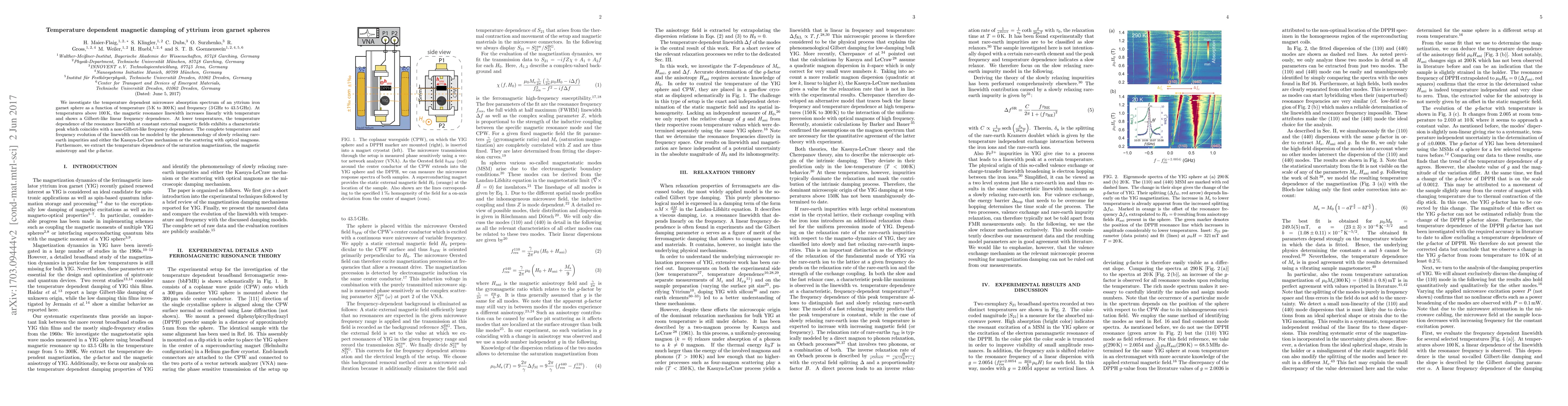 This study explores the temperature-dependent microwave absorption of yttrium iron garnet spheres, revealing a linear increase in magnetic resonance linewidth with temperature above 100 K and a peak at lower temperatures, modeled by rare-earth impurity relaxation mechanisms. The research also determines the temperature dependence of saturation magnetization, magnetic anisotropy, and the g-factor.