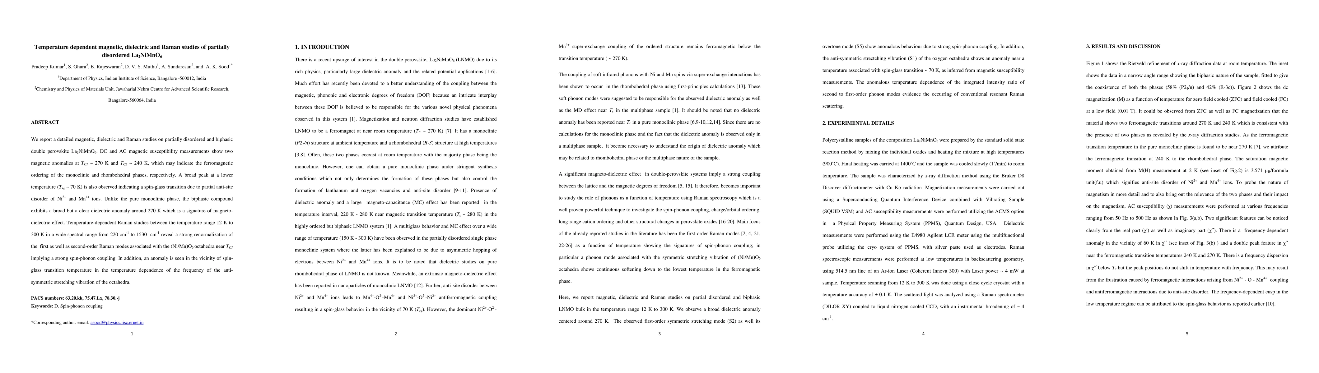 This study investigates the magnetic, dielectric, and Raman properties of partially disordered La2NiMnO6, revealing two magnetic transition temperatures indicating ferromagnetism in monoclinic and rhombohedral phases, and a spin-glass transition at lower temperatures due to ion disorder. The compound shows a magneto-dielectric effect and strong spin-phonon coupling evidenced by Raman studies.