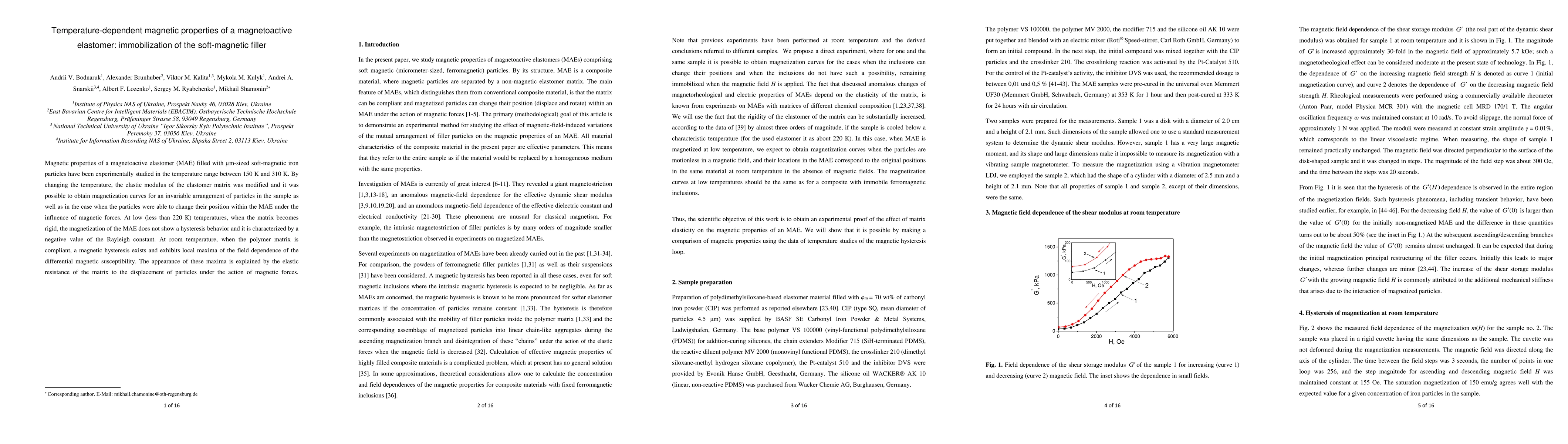 This paper investigates the temperature-dependent magnetic properties of a magnetoactive elastomer filled with soft-magnetic iron particles, revealing that low temperatures induce rigidity and non-hysteretic magnetization, while room temperature allows for magnetic hysteresis and susceptibility maxima due to matrix elasticity.