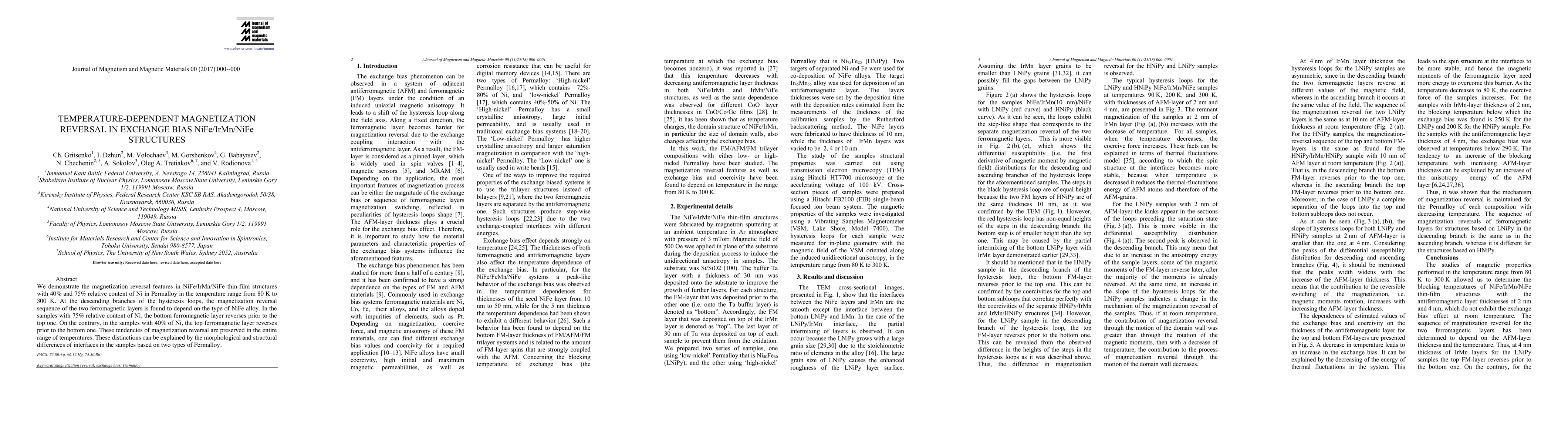 This study investigates temperature-dependent magnetization reversal in NiFe/IrMn/NiFe thin-film structures with varying Ni content, revealing that the reversal sequence in the two ferromagnetic layers depends on the NiFe alloy composition and is preserved across temperatures from 80 K to 300 K. Differences in interface morphology and structure explain the observed reversal behavior.