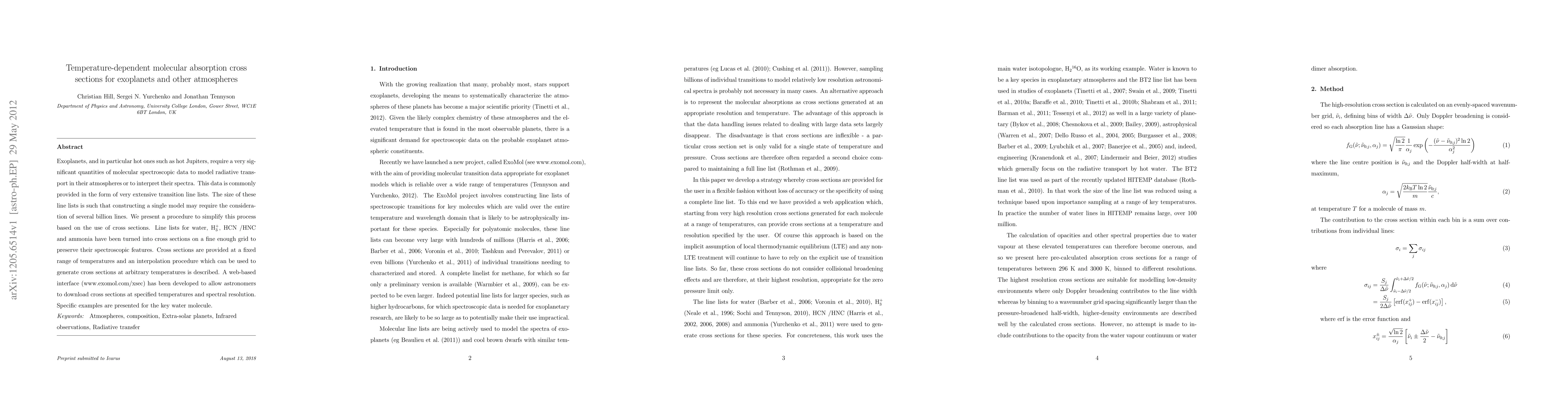This paper presents a method to simplify the modeling of exoplanet atmospheres by converting extensive molecular spectroscopic line lists into temperature-dependent molecular absorption cross sections. A web-based interface is provided for astronomers to access these cross sections, facilitating the interpretation of exoplanet spectra.